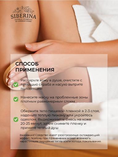 Распарьте кожу в душе, очистите с помощью скраба и насухо вытрите полотенцем. Нанесите маску на проблемные зоны плотным равномерным слоем. Оберните тело пищевой пленкой в 2-3 слоя, наденьте теплую пижаму или укройтесь одеялом. Средство имеет разогревающе-охлаждающий эффект, поэтому при применении может возникать нарастающее ощущение тепла и/или холода, покалывание. Выдерживайте смесь на коже 20-25 минут, затем снимите пленку и примите теплый душ.