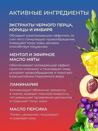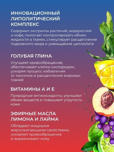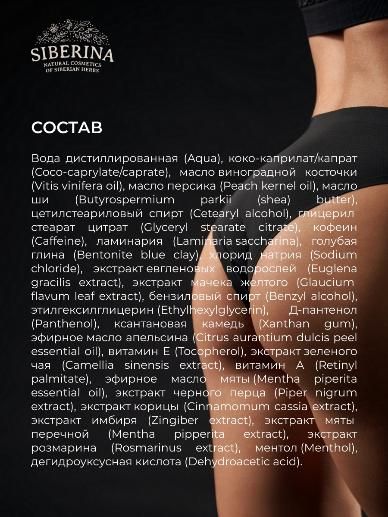 Состав: вода дистиллированная (aqua), коко-каприлат/капрат (сoco-caprylate/caprate), масло виноградной косточки (vitis vinifera oil), масло персика (peach kernel oil), масло ши (вutyrospermium parkii (shea) butter), цетилстеариловый спирт (cetearyl alcohol), глицерил стеарат цитрат (glyceryl stearate citrate), кофеин (caffeine), ламинария (laminaria saccharina), голубая глина (bentonite blue clay), хлорид натрия (sodium chloride), экстракт евгленовых водорослей (euglena gracilis extract), экстракт мачека желтого (glaucium flavum leaf extract), бензиловый спирт (benzyl alcohol), этилгексилглицерин (ethylhexylglycerin), д-пантенол (panthenol), ксантановая камедь (xanthan gum), эфирное масло апельсина (citrus aurantium dulcis peel essential oil), витамин е (tocopherol), экстракт зеленого чая (camellia sinensis extract), витамин а (retinyl palmitate), эфирное масло мяты (mentha piperita essential oil), экстракт черного перца (piper nigrum extract), экстракт корицы (cinnamomum cassia extract), экстракт имбиря (zingiber extract), экстракт мяты перечной (mentha pipperita extract), экстракт розмарина (rosmarinus extract), ментол (menthol), дегидроуксусная кислота (dehydroacetic acid)