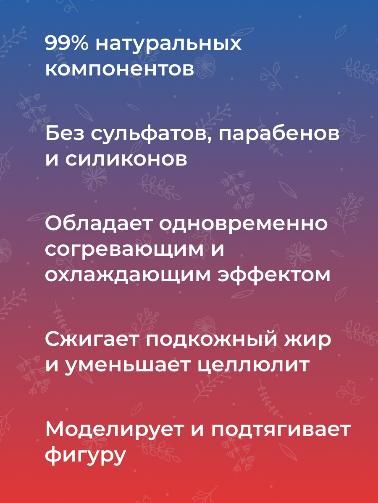 Благодаря оригинальной комбинации компонентов натуральная маска-лифтинг обладает двойным действием: ментол и эфирное масло мяты охлаждают, а комплекс экстрактов черного перца, корицы и имбиря, наоборот, оказывает согревающий эффект. Такое контрастное воздействие стимулирует рецепторы и усиливает кровообращение в клетках кожи. За счет этого маска способствует уменьшению отечности, тонизирует и подтягивает кожу проблемных зон, формируя привлекательный силуэт.