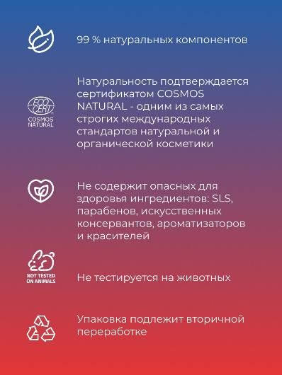 Создано из природных компонентов высокого качества. Не содержит SLS, парабенов, искусственных консервантов, ароматизаторов и красителей.