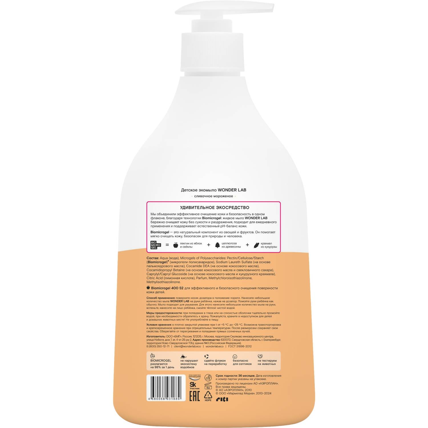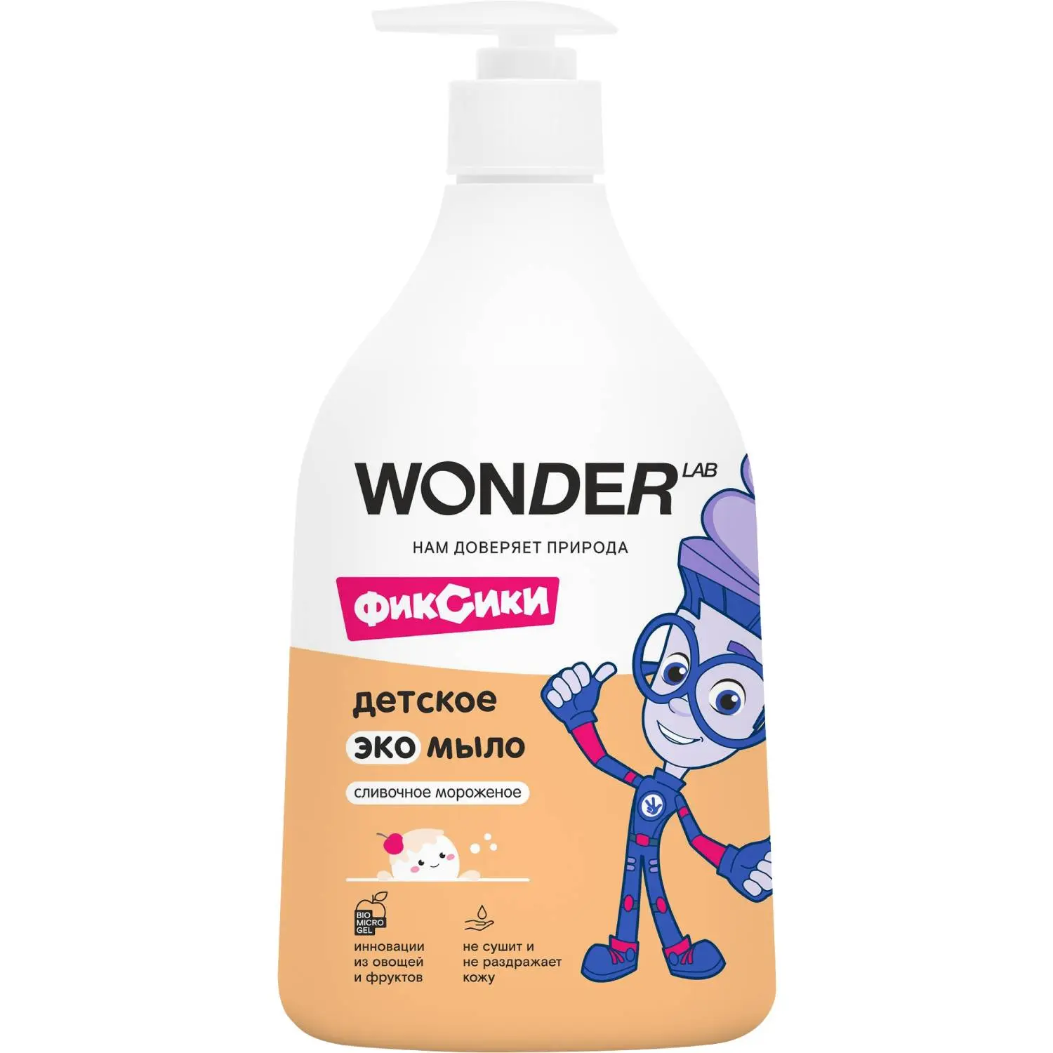 Безопасное жидкое экомыло с вкусным ароматом сливочного мороженого для детей. Полностью смывается водой. Можно использовать с первых дней жизни.