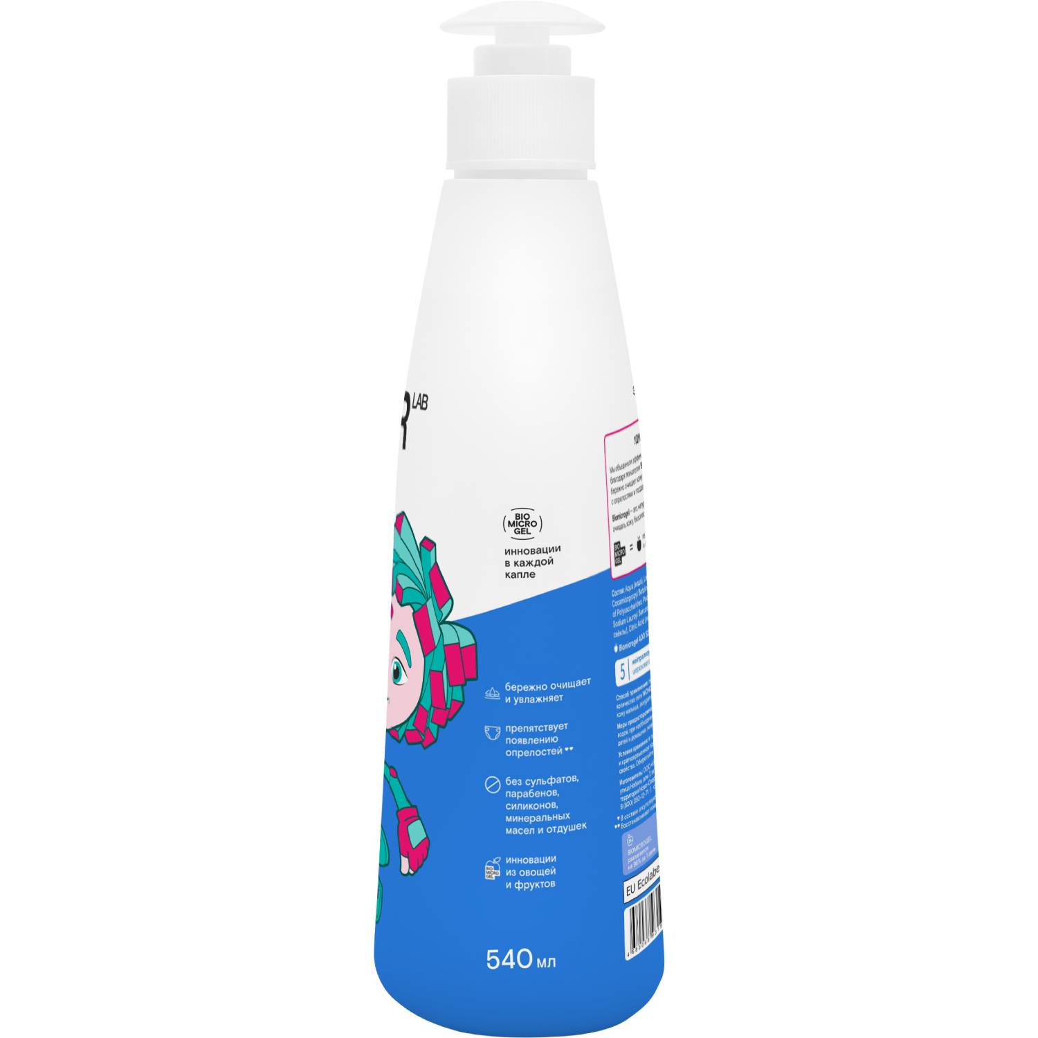 Состав: Aqua (вода), Lauryl Glucoside (на основе кокосового масла и сахара), Cocamidopropyl Betaine (на основе кокосового масла и свекловичного сахара), Microgels of Polysaccharides: Pectin/ Cellulose/ Starch (Biomicrogel)(яблочко) (микрогели полисахаридов), Sodium Lauroyl Sarcosinate (на основе пальмоядрового масла), Citric Acid (лимонная кислота), Betaine (на основе сока свеклы), Methylchloroisothiazolinone, Methylisothiazolinone.