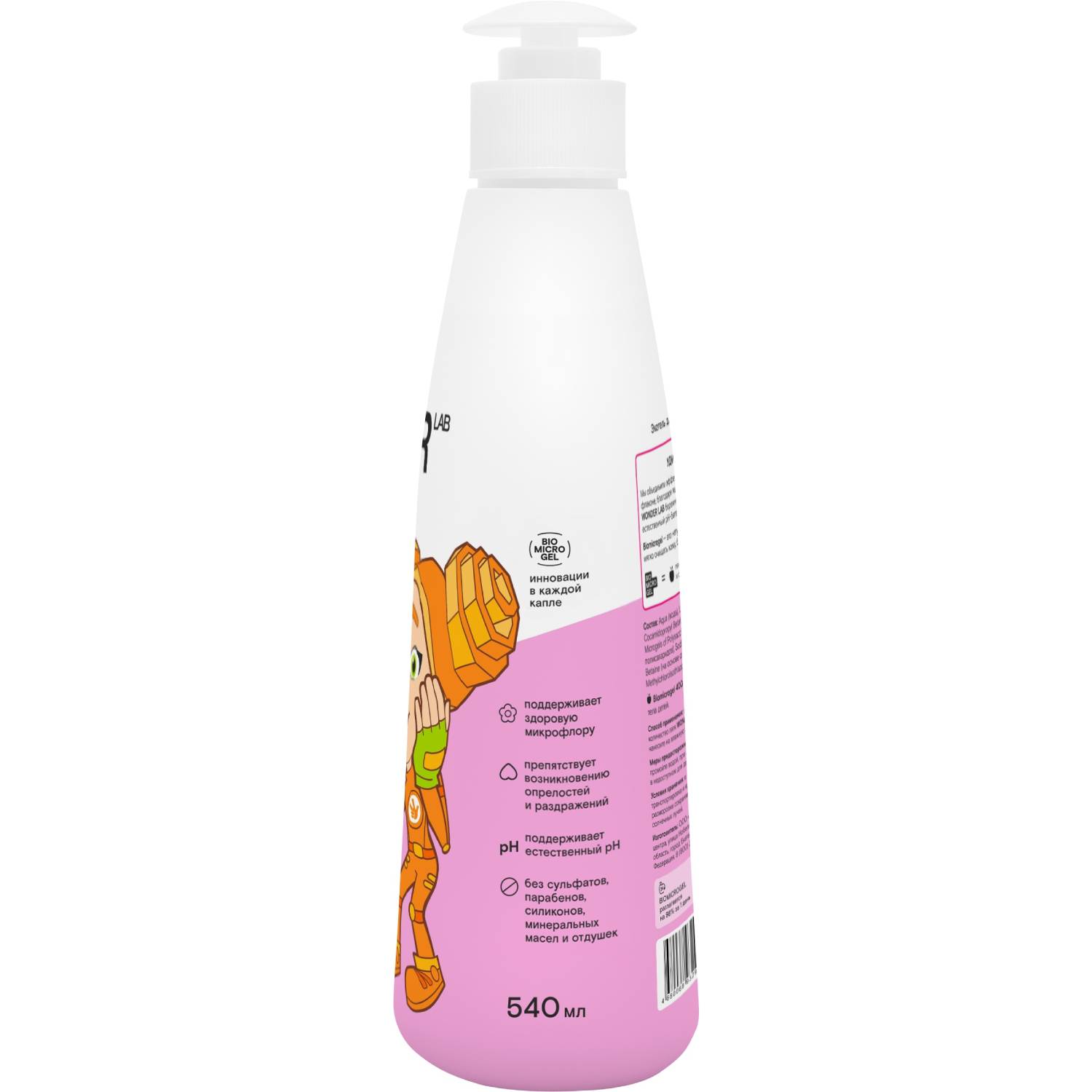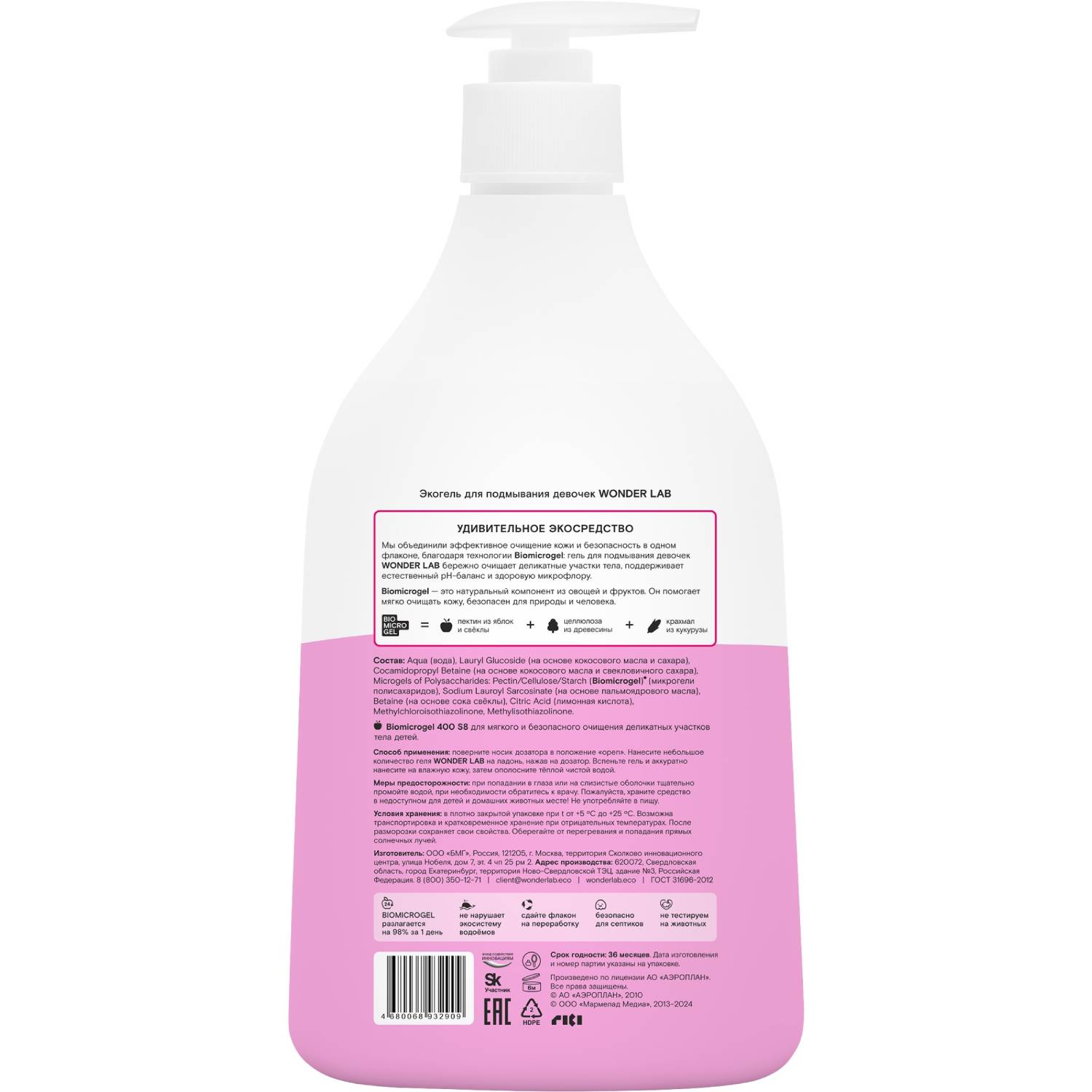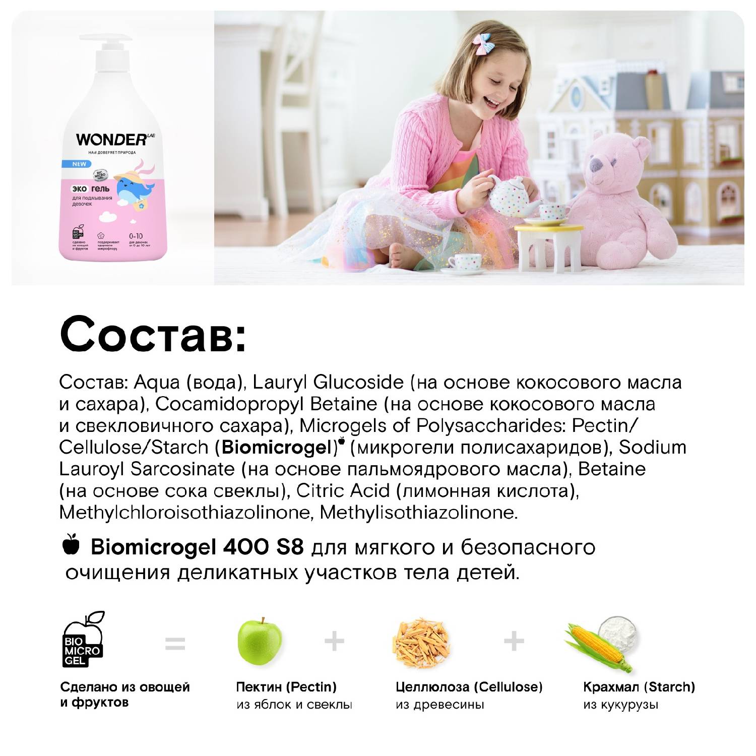 Состав: Aqua (вода), Lauryl Glucoside (на основе кокосового масла и сахара), Cocamidopropyl Betaine (на основе кокосового масла и свекловичного сахара), Microgels of Polysaccharides: Pectin/ Cellulose/ Starch (Biomicrogel)(яблочко) (микрогели полисахаридов), Sodium Lauroyl Sarcosinate (на основе пальмоядрового масла), Citric Acid (лимонная кислота), Betaine (на основе сока свеклы), Methylchloroisothiazolinone, Methylisothiazolinone.
