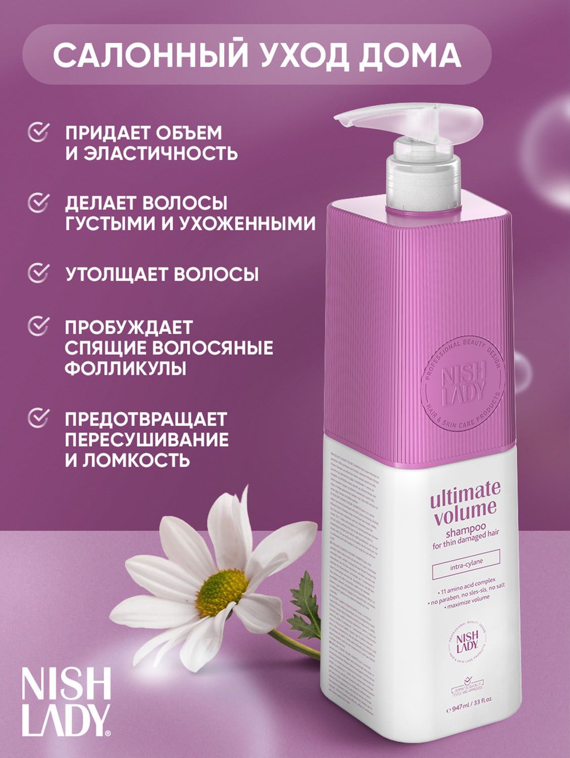Шампунь с бессульфатной формулой для объема волос Ultimate Volume от бренда NISHLADY насыщает волосы питательными веществами. Проникая внутрь волоса, они улучшают его структуру и делают его более крепким и плотным. В результате волосы выглядят заметно более здоровыми и обладают естественным объемом. Активные компоненты способствуют пробуждению спящих фолликул, стимулируют рост волос, защищают волосы от вредного воздействия.