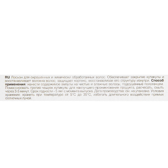 Равномерно нанесите содержимое ампулы по всей длине вымытых и высушенных волос – можно использовать прилагаемой ампулы с наконечником кисть или расческу. Легкими движениями вмассируйте в волосы. Удерживайте от 5 до 20 минут - рекомендуется накрыть волосы полиэтиленовой шапочкой, чтобы лосьон не высох на волосах. Тщательно смойте теплой водой.