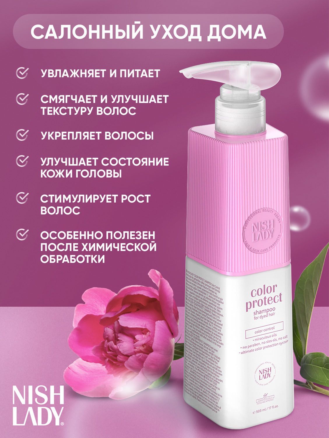 Шампунь для окрашенных волос питает волосы изнутри и защищает цвет волос от вымывания, способствует восстановлению и укреплению волос. Это особенно полезно для волос, поврежденных химической обработки или тепловыми воздействиями.