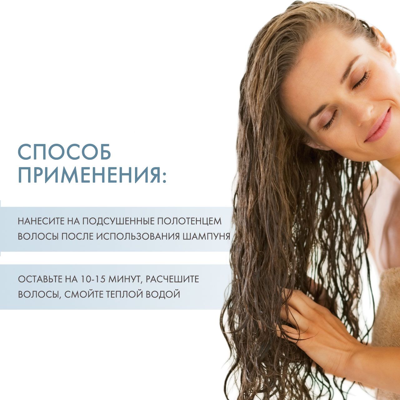 Нанесите на подсушенные полотенцем волосы после использования шампуня. Оставьте на 10-15 минут, расчешите волосы, смойте теплой водой.