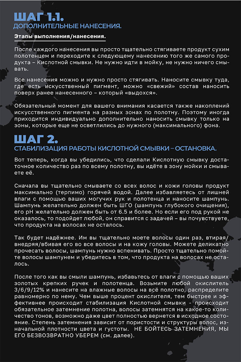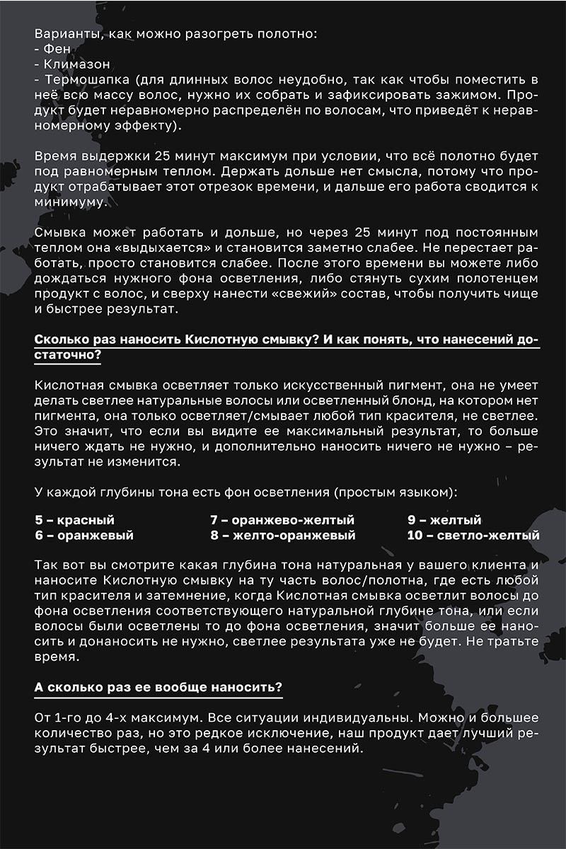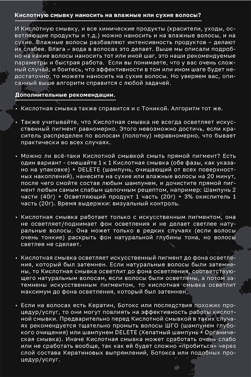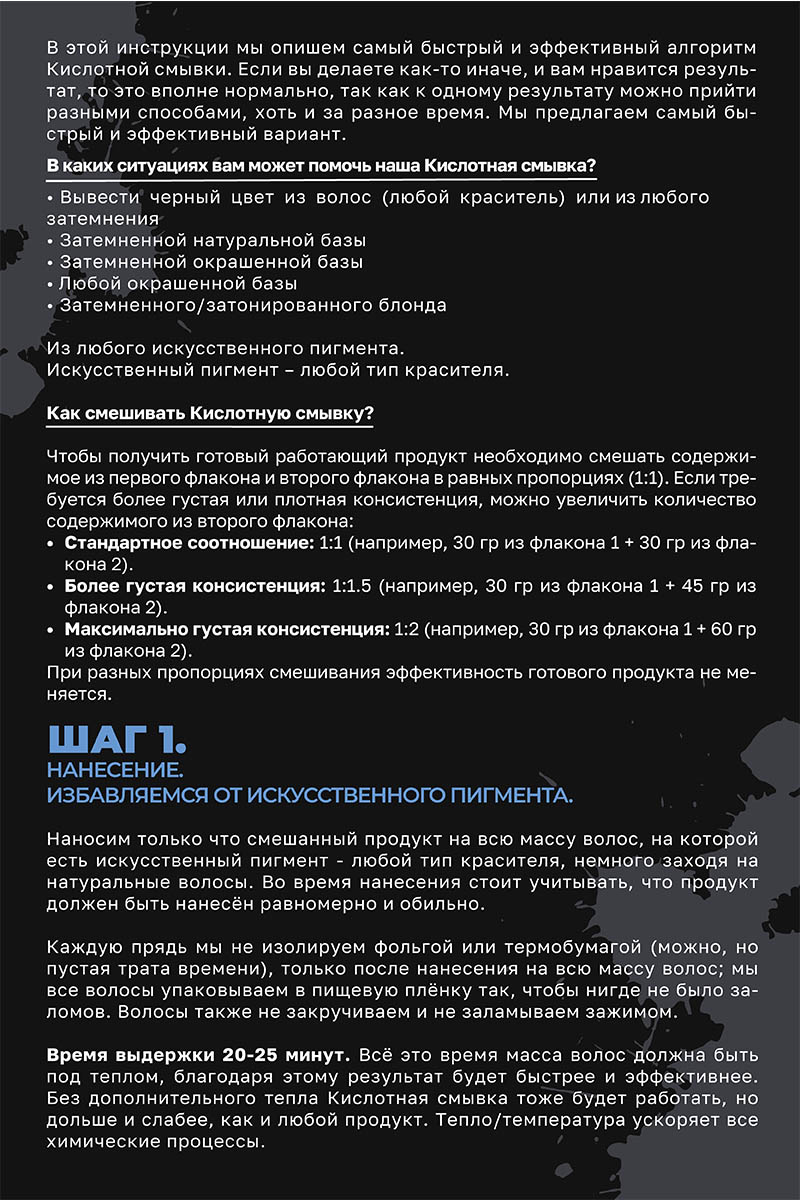 Смывание: тщательно смойте состав с волос горячей водой. Используйте очищающий шампунь с pH 6.5 или выше. Продукт не осветляет/обесцвечивает натуральные волосы. Действует только на окрашенные волосы с искусственным пигментом.