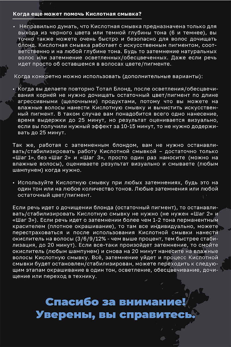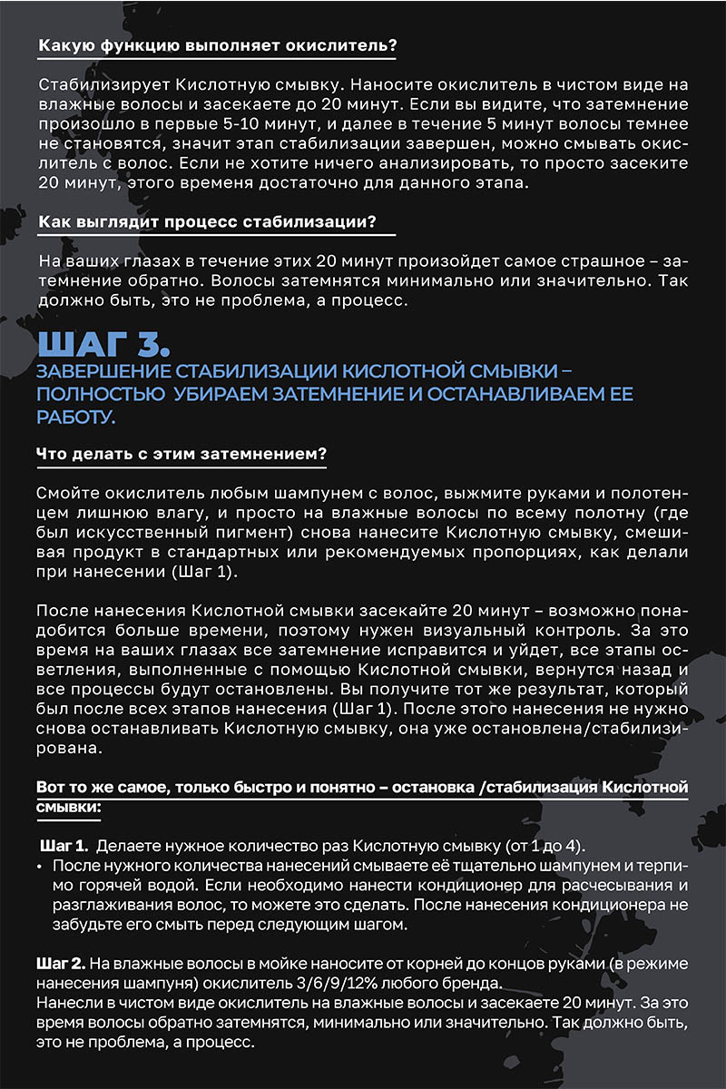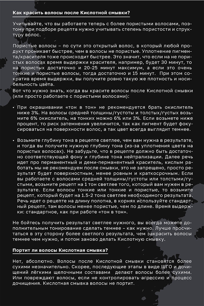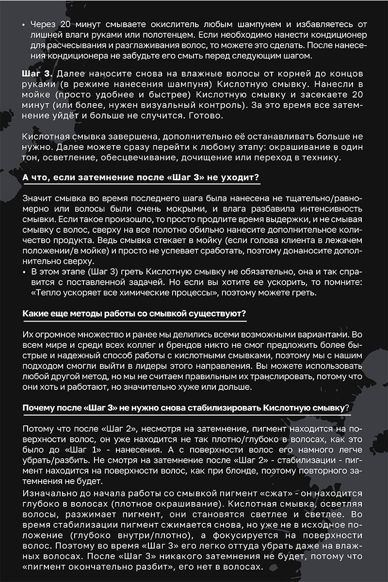 Смывание: тщательно смойте состав с волос горячей водой. Используйте очищающий шампунь с pH 6.5 или выше. Продукт не осветляет/обесцвечивает натуральные волосы. Действует только на окрашенные волосы с искусственным пигментом.