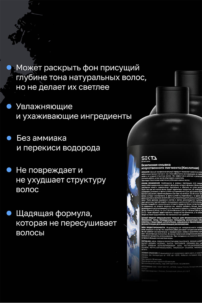 Профессиональная кислотная смывка для удаления искусственного пигмента — это эффективное и безопасное средство для устранения любых синтетических красителей без вреда для волос. Она разрушает даже стойкие бытовые краски, обеспечивая безопасное осветление и обесцвечивание. Смывка бережно воздействует на структуру волос, предотвращая пересушивание и повреждение.