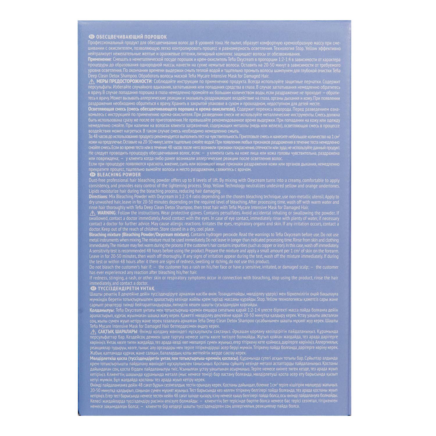 Смешать с кремом-окислителем до образования однородной массы согласно выбранной технике обесцвечивания. Нанести на сухие немытые волосы. По окончании времени выдержки смыть теплой водой. Тщательно промыть волосы шампунем для глубокой очистки Tefia Deep Clean Detox Shampoo. Обработать волосы маской Tefia Mycare Intensive Mask for Damaged Hair.