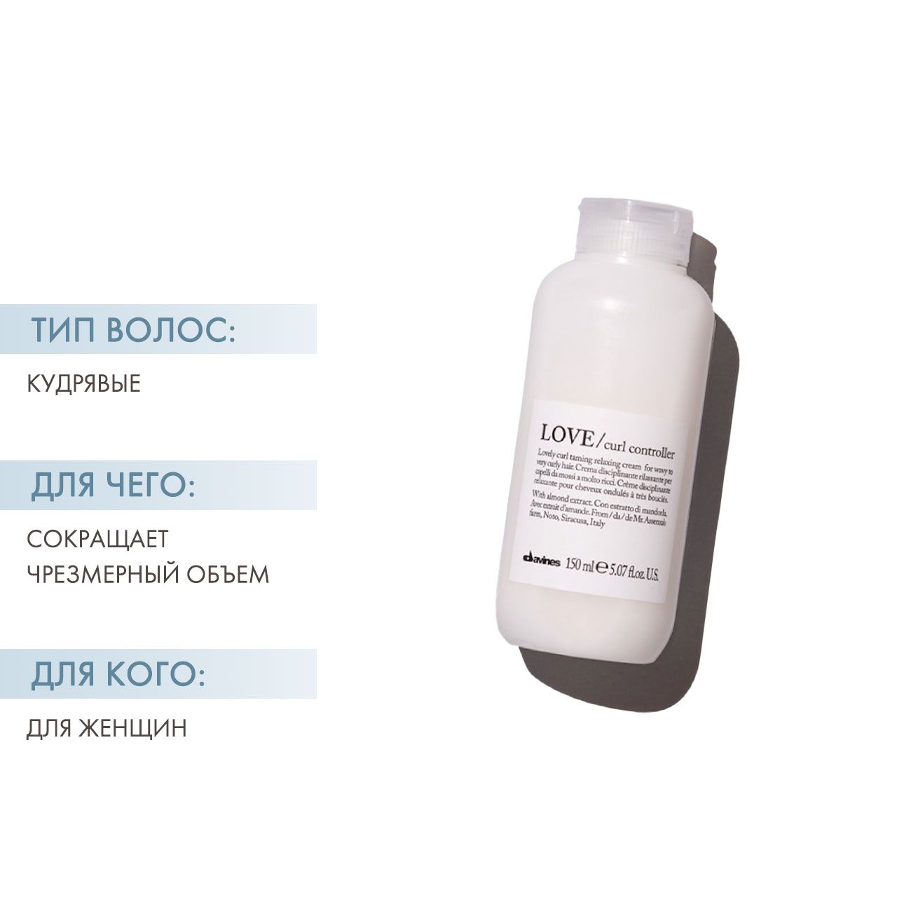 - сокращает чрезмерный объем кудрявых волос, оставляя их мягкими и блестящими