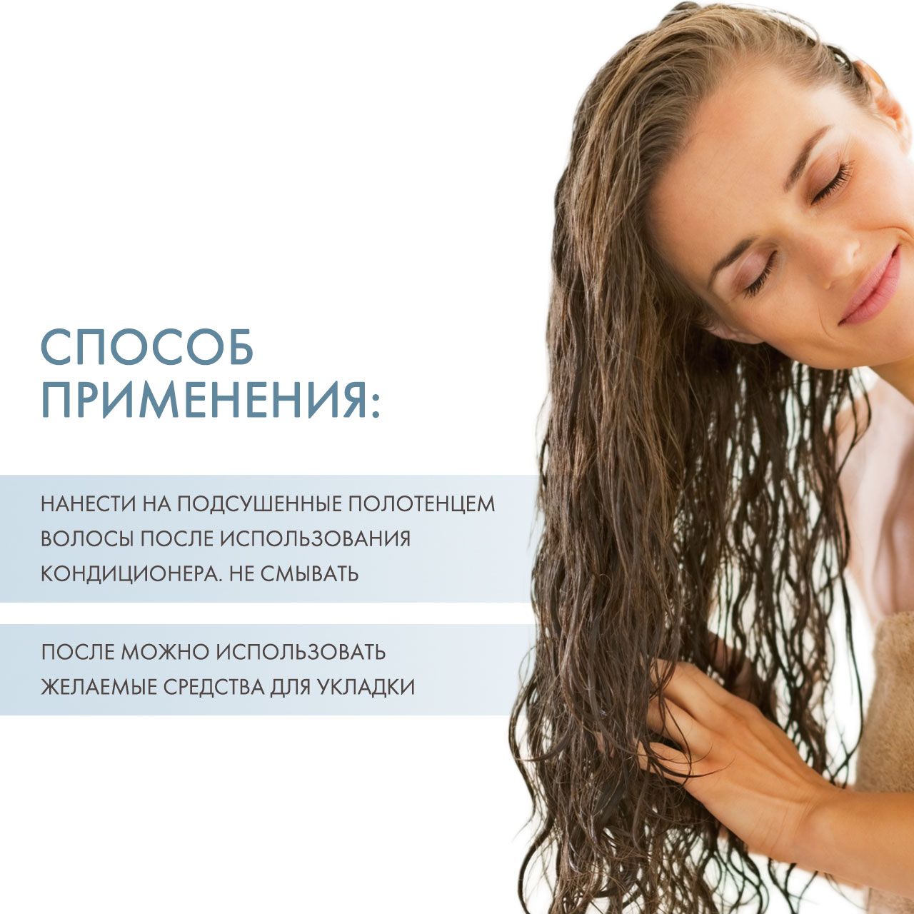 Нанести на подсушенные полотенцем волосы после использования кондиционера для усиления завитка. Не смывать. После можно использовать желаемые средства для укладки.