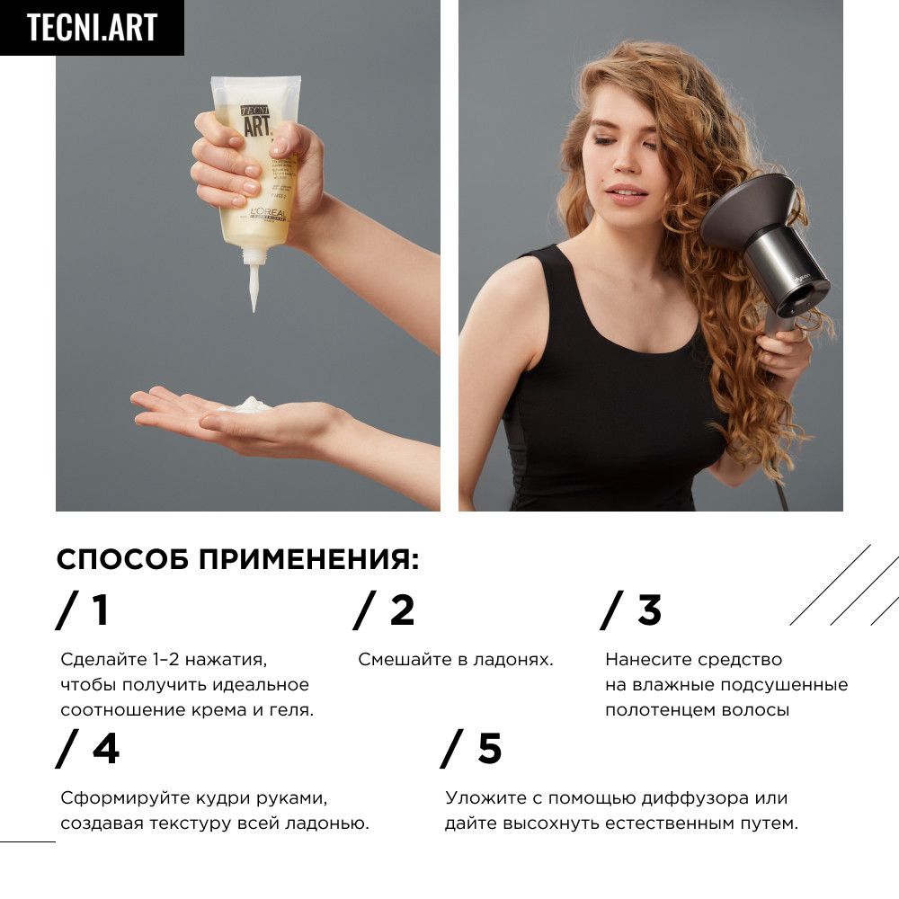 Сделайте 1-2 нажатия, смешайте в ладонях. Нанесите средство на влажные, подсушенные полотенцем волосы. Сформируйте кудри руками, создавая текстуру всей ладонью.