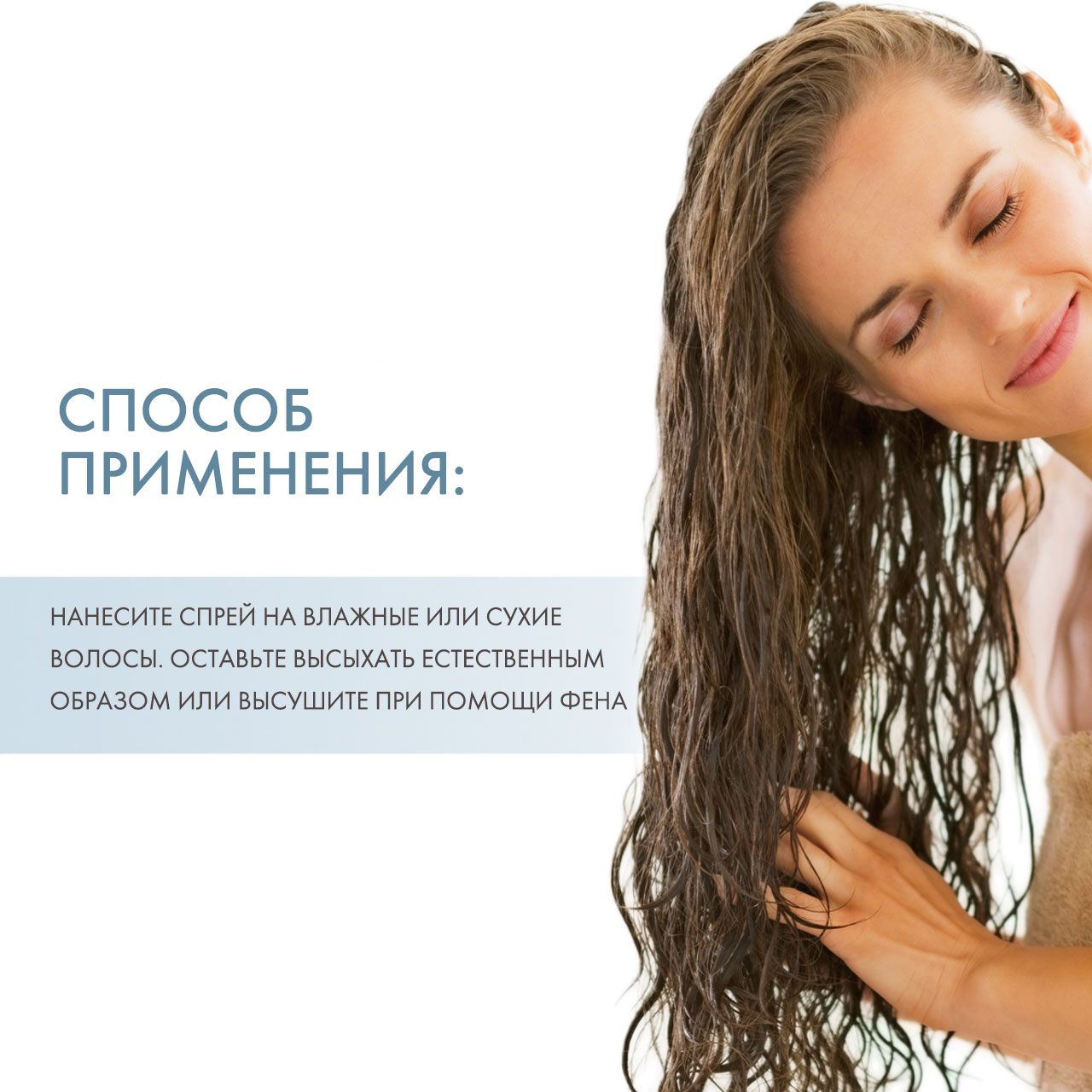 Нанесите спрей на влажные или сухие волосы от корней до кончиков. Оставьте высыхать естественным образом или высушите при помощи фена с диффузором.
