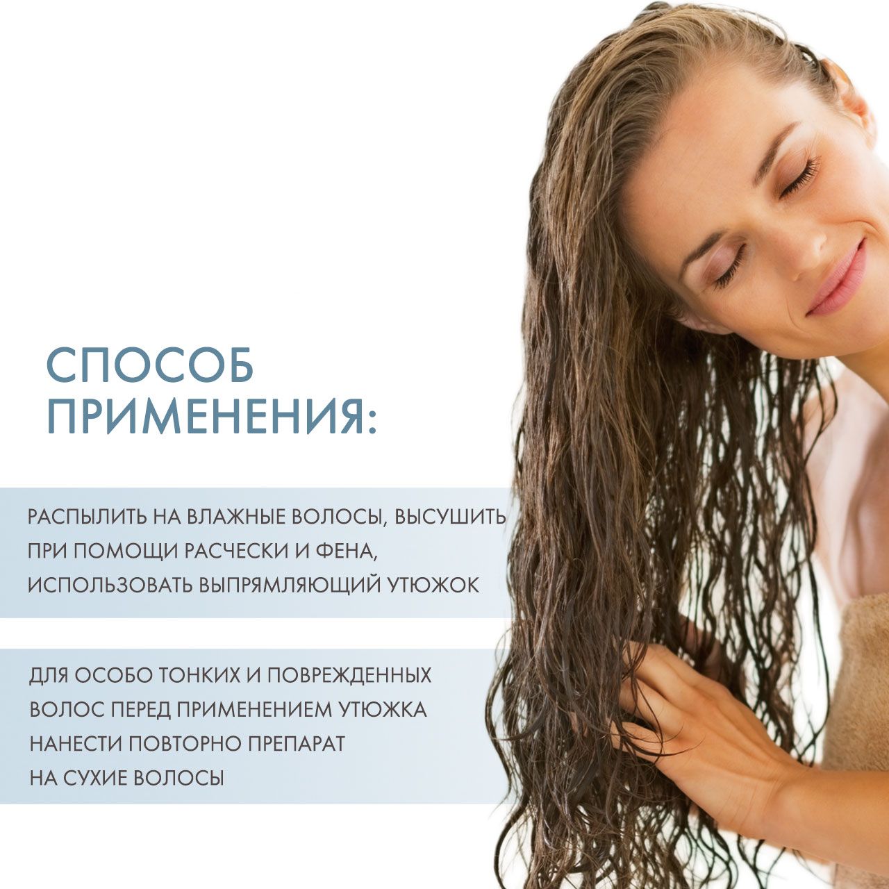 Спрей следует распылить на влажные волосы, высушить при помощи расчески и фена и использовать выпрямляющий утюжок. Для особо тонких и поврежденных волос перед применением утюжка нанести повторно препарат на сухие волосы.