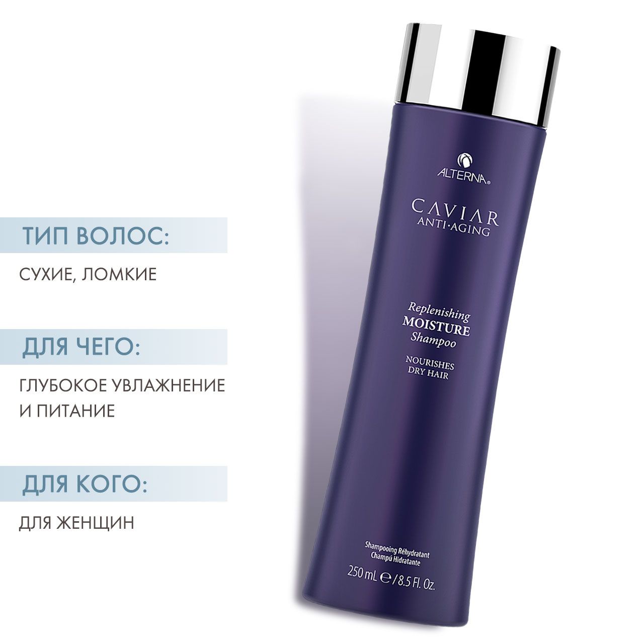 Шампунь для увлажнения c морским шелком и экстрактом черный икры насыщает волосы необходимой влагой и восстанавливает их эластичность. Улучшает метаболические процессы эпидермиса, питает, повышает защитную функцию кожи головы. Возвращает волосам насыщенный блеск, защищает и сохраняет стойкость цвета. Шампунь для увлажнения c морским шелком и экстрактом черный икры насыщает волосы необходимой влагой и восстанавливает их эластичность. Улучшает метаболические процессы эпидермиса, питает, повышает защитную функцию кожи головы. Возвращает волосам насыщенный блеск, защищает и сохраняет стойкость цвета. Средства линии Caviar Anti-Aging Moisture – идеальное сочетание комбинаций морских водорослей и комплекса против старения Age-Control на основе черной икры и витамина С. Комбинация морских водорослей способствует увлажнению, питанию волос и кожи головы. Комплекс против старения Age-Control борется с естественным старением волос, а также противостоят термическим, химическим и экологическим негативным факторам.