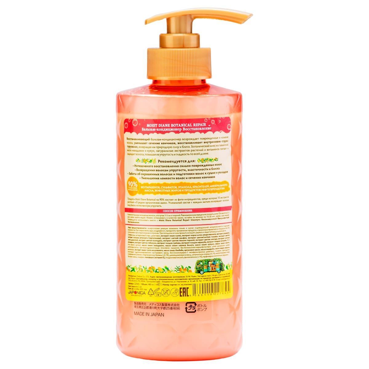 Бальзам-кондиционер не содержит минеральные масла, этанол, красители, животные жиры и продукты нефтепереработки. Для ежедневного применения. Обладает свежим фруктовым ароматом. Рекомендуется использовать вместе с Moist Diane Botanical Repair Шампунь бессиликоновый бессульфатный Восстановление.
