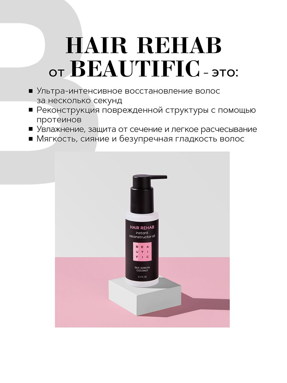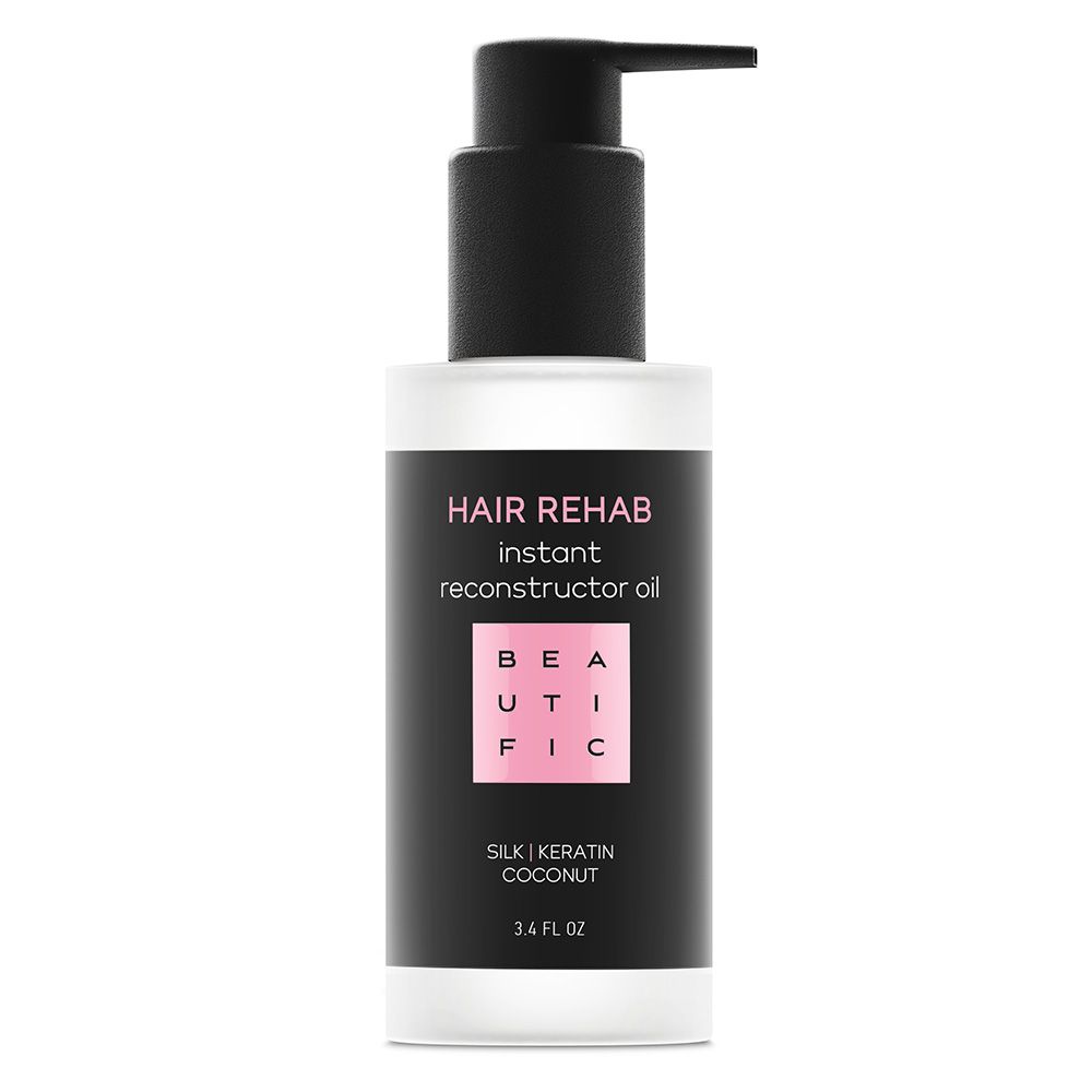 Верни волосам сияние и гладкость шелка в несколько секунд! Сенсационное масло-реконструктор для сильно поврежденных волос Beautific Hair Rehab разработано, чтобы дарить твоим локонам преображение, которое видно сразу. Компоненты заполняют поврежденные участки, насыщают волосы микроэлементами и протеинами, увлажняют, защищают, облегчают расчесывания, повышают эластичность и устойчивость волоса к повреждениям, сушке и укладкам. Масло предотвращает сечение волос и нейтрализует его признаки, разглаживает, придает трендовый здоровый блеск.