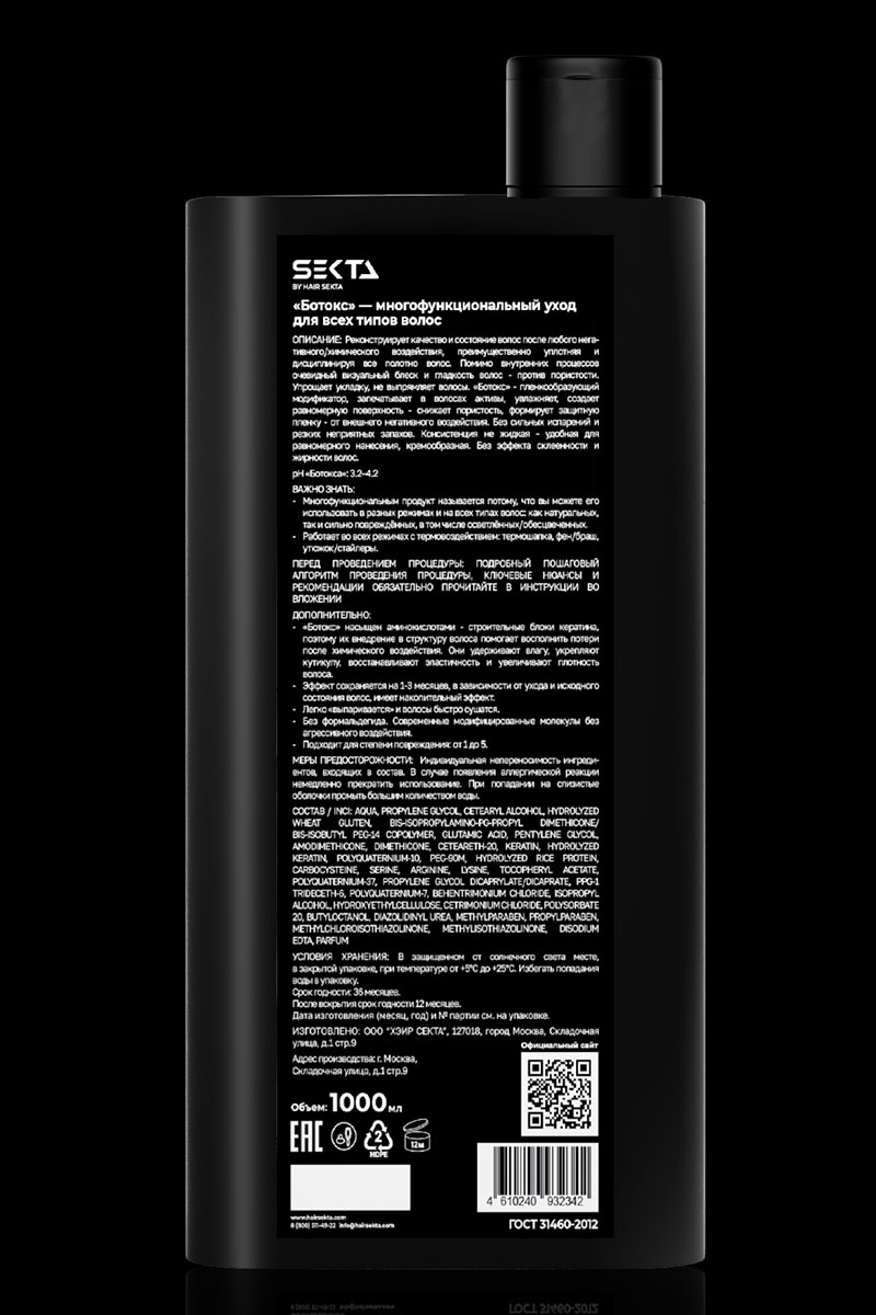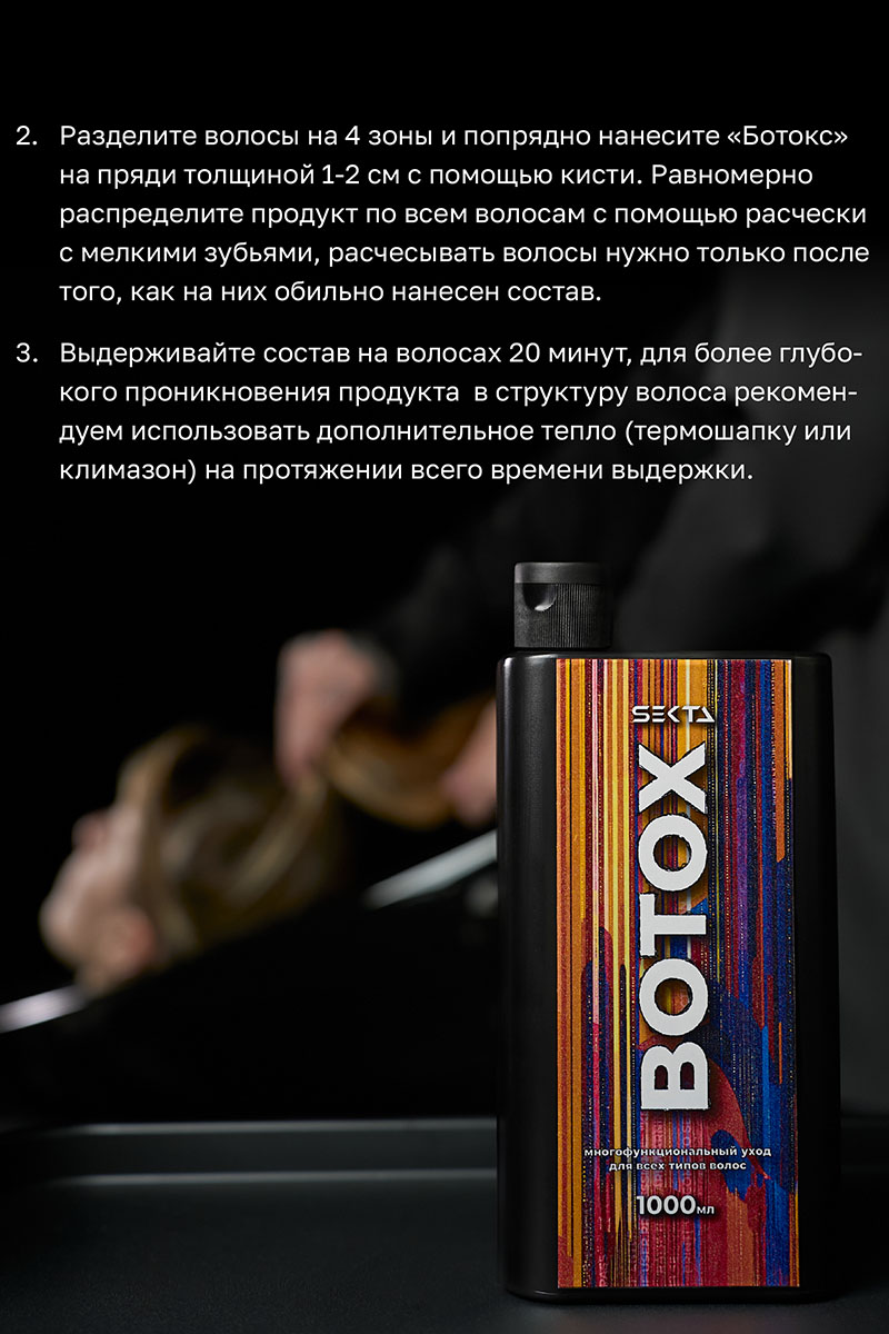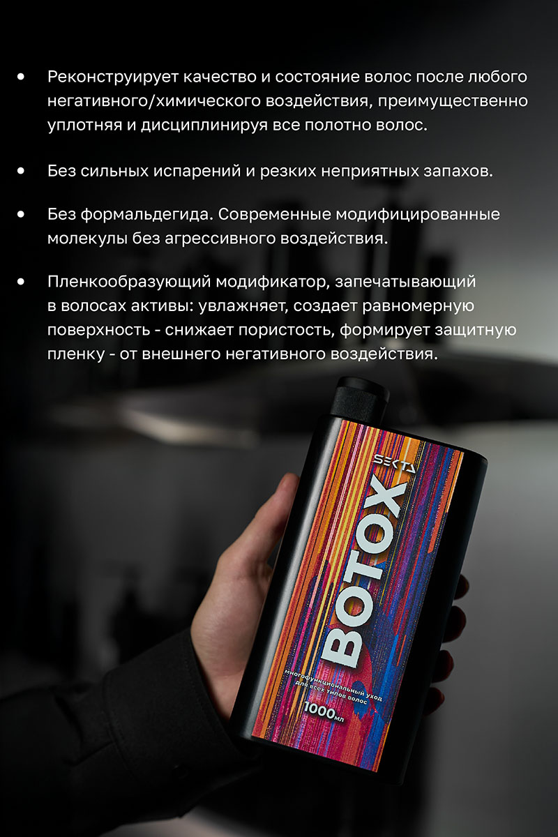 «Ботокс» — пленкообразующий модификатор, запечатывает в волосах активы, увлажняет и создает равномерную поверхность, а также формирует защитную пленку. Подходит для использования в различных режимах и на всех типах волос, включая натуральные, сильно поврежденные, осветленные и обесцвеченные. Эффект сохраняется от 1 до 3 месяцев, в зависимости от домашнего ухода и исходного состояния волос, имеет накопительный эффект.