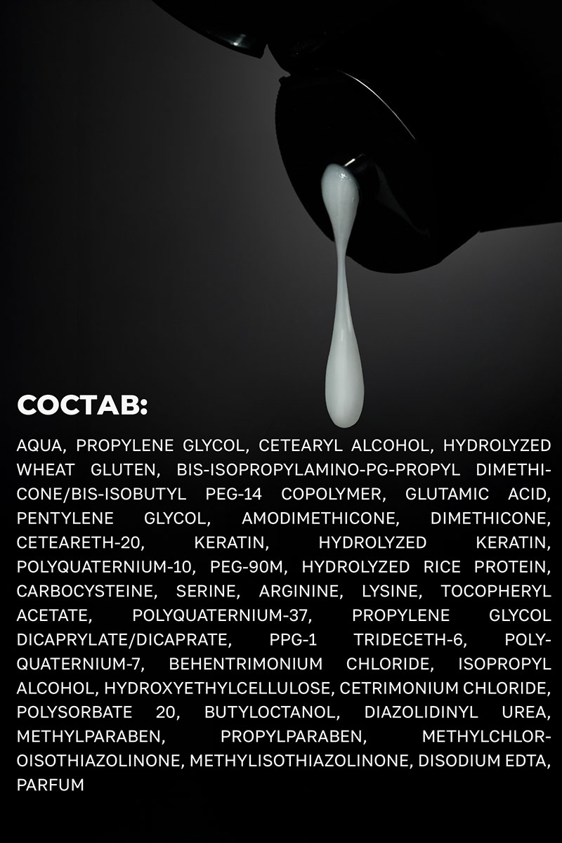 Состав: aqua, propylene glycol, cetearyl alcohol, hydrolyzed wheat gluten, bis-isopropylamino-pg-propyl dimethicone/ bis-isobutyl peg-14 copolymer, glutamic acid, pentylene glycol, amodimethicone, dimethicone, ceteareth-20, keratin, hydrolyzed keratin, polyquaternium-10, peg-90m, hydrolyzed rice protein, carbocysteine, serine, arginine, lysine, tocopheryl acetate, polyquaternium-37, propylene glycol dicaprylate/dicaprate, ppg-1 trideceth-6, polyquaternium-7, behentrimonium chloride, isopropyl alcohol, hydroxyethylcellulose, cetrimonium chloride, polysorbate 20, butyloctanol, diazolidinyl urea, methylparaben, propylparaben, methylchloroisothiazolinone, methylisothiazolinone, disodium edta, parfum.
