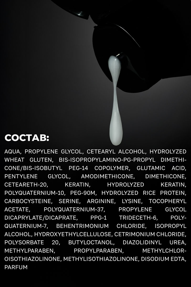 Состав: aqua, propylene glycol, cetearyl alcohol, hydrolyzed wheat gluten, bis-isopropylamino-pg-propyl dimethicone/ bis-isobutyl peg-14 copolymer, glutamic acid, pentylene glycol, amodimethicone, dimethicone, ceteareth-20, keratin, hydrolyzed keratin, polyquaternium-10, peg-90m, hydrolyzed rice protein, carbocysteine, serine, arginine, lysine, tocopheryl acetate, polyquaternium-37, propylene glycol dicaprylate/dicaprate, ppg-1 trideceth-6, polyquaternium-7, behentrimonium chloride, isopropyl alcohol, hydroxyethylcellulose, cetrimonium chloride, polysorbate 20, butyloctanol, diazolidinyl urea, methylparaben, propylparaben, methylchloroisothiazolinone, methylisothiazolinone, disodium edta, parfum.
