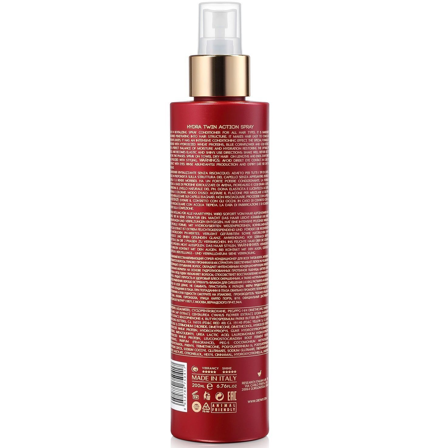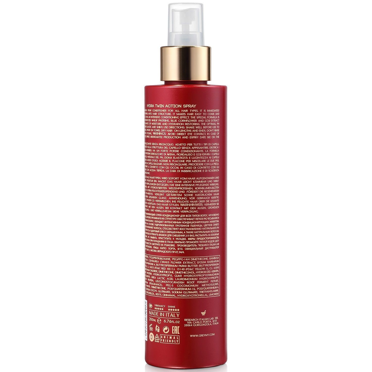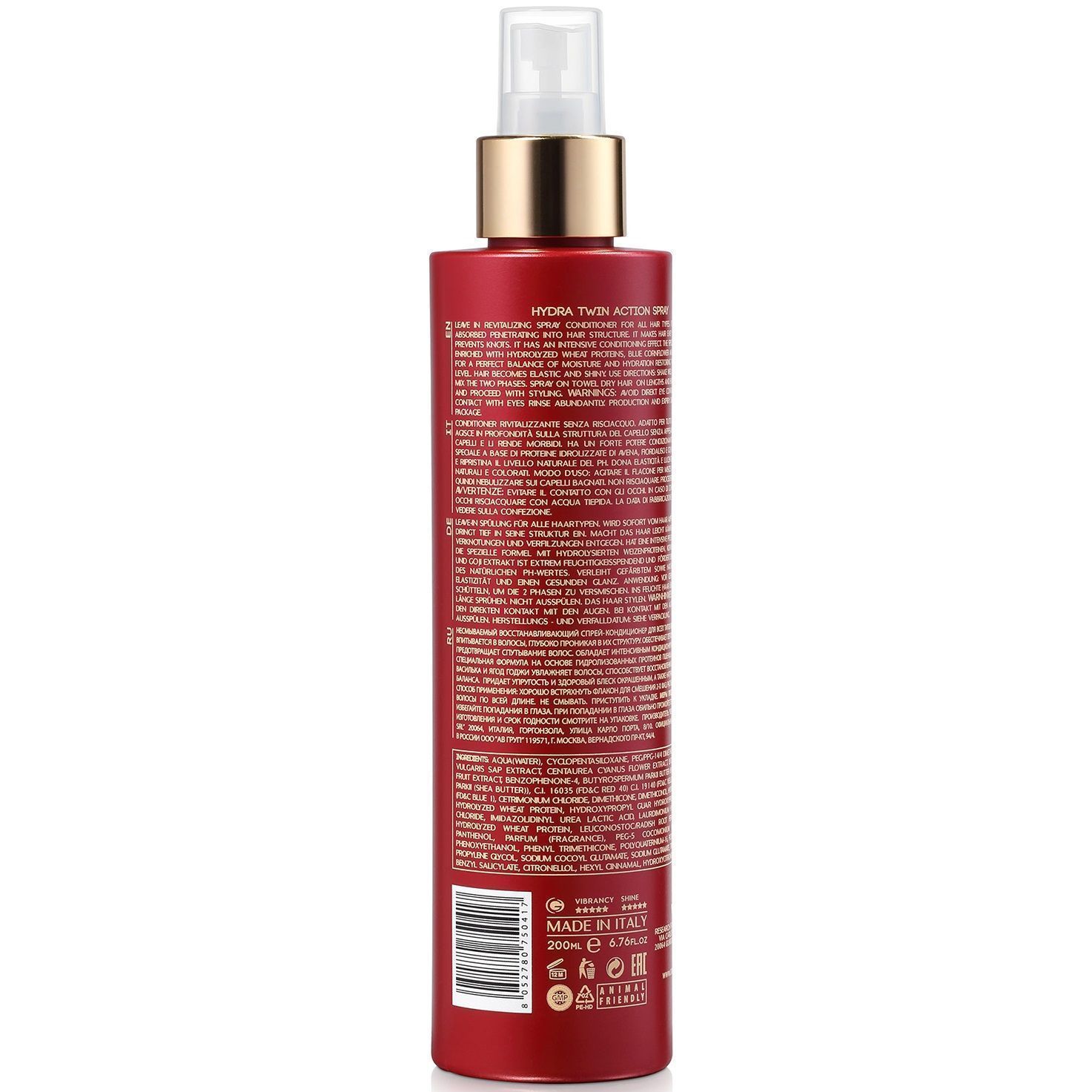 Hydra Twin Action Spray - увлажняющий спрей двойного действия для всех типов волос. Наряду с глубоким увлажнением структуры волос обеспечивает активную защиту поверхности кутикулы, способствуя стабилизации и запечатыванию цветовых пигментов. Делает волосы более мягкими, наполненными и эластичными внутри за счет активного действия гидролизованных фито-кератина и протеинов пшеницы. Одновременно усиливает гладкость снаружи, шелковистость и блеск волос основанные на действии особых растительных экстрактов и масла дерева ши.