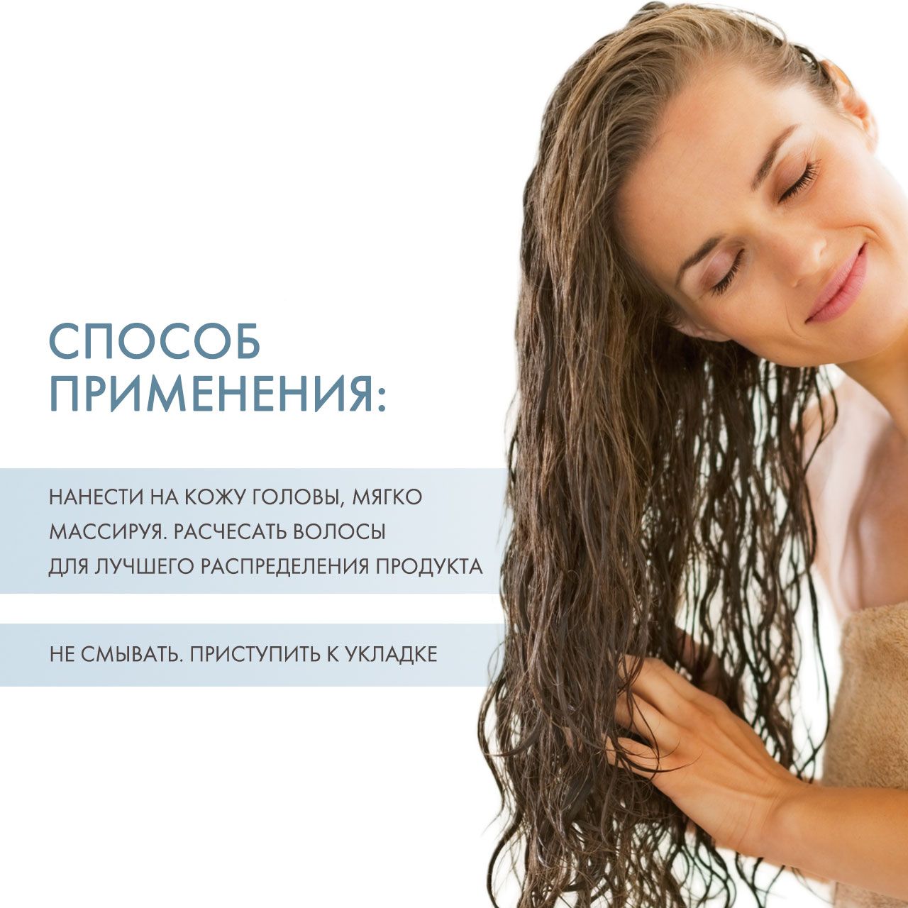 Нанести на кожу головы, мягко массируя. Расчесать волосы для лучшего распределения продукта. Не смывать. Приступить к укладке