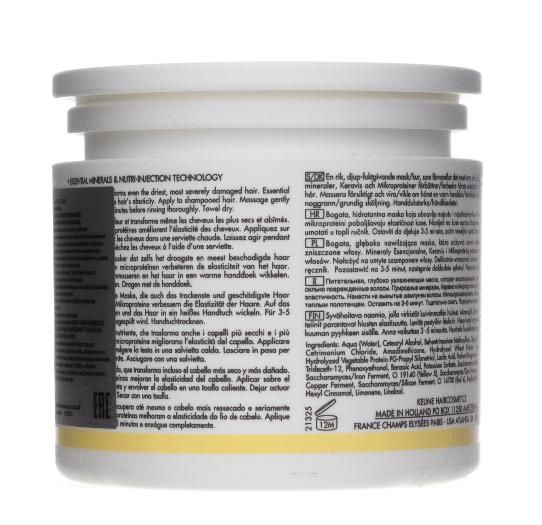 Маска разработана по современным стандартам ухода за волосами. В состав включены только высококачественные компоненты, которые интенсивно ухаживают за сухими, пористыми и поврежденными волосами. После применения маски волосы приобретают блеск и эластичность. Восстанавливается водный и кислотный баланс волос и кожи головы. Маска помогает распутать волосы и облегчает процесс расчесывания волос. Кутикула запечатывается и волосы приобретают головокружительную гладкость.