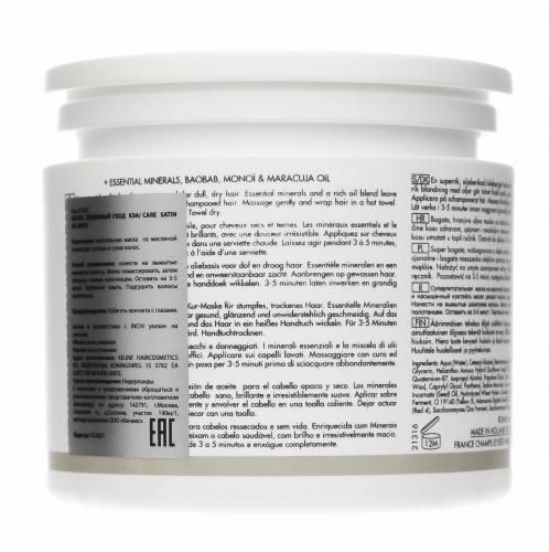 Маска обладает интенсивным восстанавливающим действием. Активные компоненты проникаю глубоко в кутикулу волоса и питают его изнутри. Маска придает волосам естественный блеск, невероятную мягкость и головокружительную гладкость. После применения волосы приобретают здоровый внешний вид.