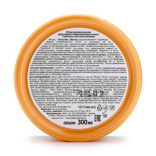 Состав: aqua with infusions of humulus lupulus flower extract (экстракт хмеля), arctium lappa root extract* (экстракт лопуха большого), urtica dioica leaf extract* (экстракт крапиваы), rhodolia rosea root extract* (экстракт родиолы розовой), sorbus sibirica extract*(экстракт рябины сибирской), cetearyl alcohol, argania spinosa seed oil (марокканское масло арганы), hippophae rhamnoides fruit oil* (масло алтайской облепихи), macadamia ternifolia nut oil (масло макадамии), olea europaea fruit oil*, cetrimonium chloride, pinus sibirica seed oil* (масло кедра), cetyl esters, behentrimonium chloride, glyceryl stearate, bis-cetearyl amodimethicone, cyclopentasiloxane, dimethicone, dimethiconol, hydrolyzed keratin (гидролизованный кератин), hydrolyzed wheat protein, hippophae rhamnoidesamidopropyl betaine, panthenol (провитамин в5), tocopheryl acetate (витамин е), glyceryl linoleate, glyceryl oleate, glyceryl linolenate, retinyl palmitate (витамин а), helianthus annuus (sunflower) seed oil, hydroxyethylcellulose, biotin (витамин н), sodium lactate, arginine, aspartic asid, benzyl alcohol,benzoic acid, sorbic acide, parfum, citric acid