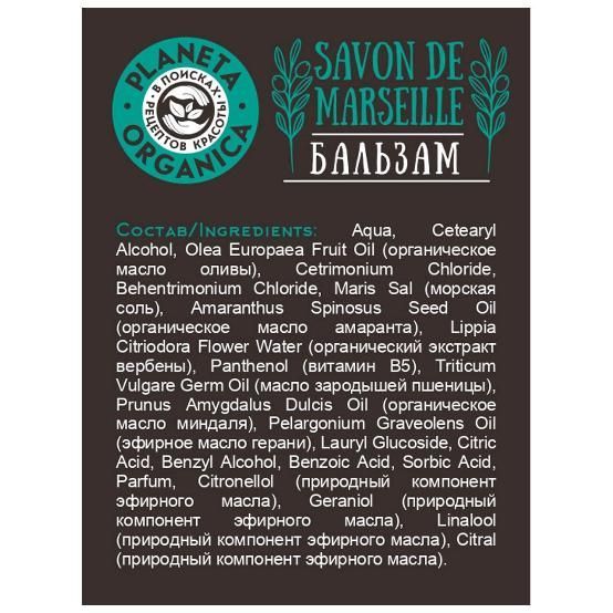 Состав: aqua, cetearyl alcohol, olea europaea fruit oil (органическое масло оливы), cetrimonium chloride, behentrimonium chloride, maris sal (морская соль), amaranthus spinosus seed oil (органическое масло амаранта), lippia citriodora flower water (органический экстракт вербены), panthenol (витамин в5), triticum vulgare germ oil (масло зародышей пшеницы), prunus amygdalus dulcis oil (органическое масло миндаля), pelargonium graveolens oil (эфирное масло герани), lauryl glucoside, citric acid, benzyl alcohol, benzoic acid, sorbic acid, parfum, citronellol (природный компонент эфирного масла), geraniol (природный компонент эфирного масла), linalool (природный компонент эфирного масла), citral (природный компонент эфирного масла).