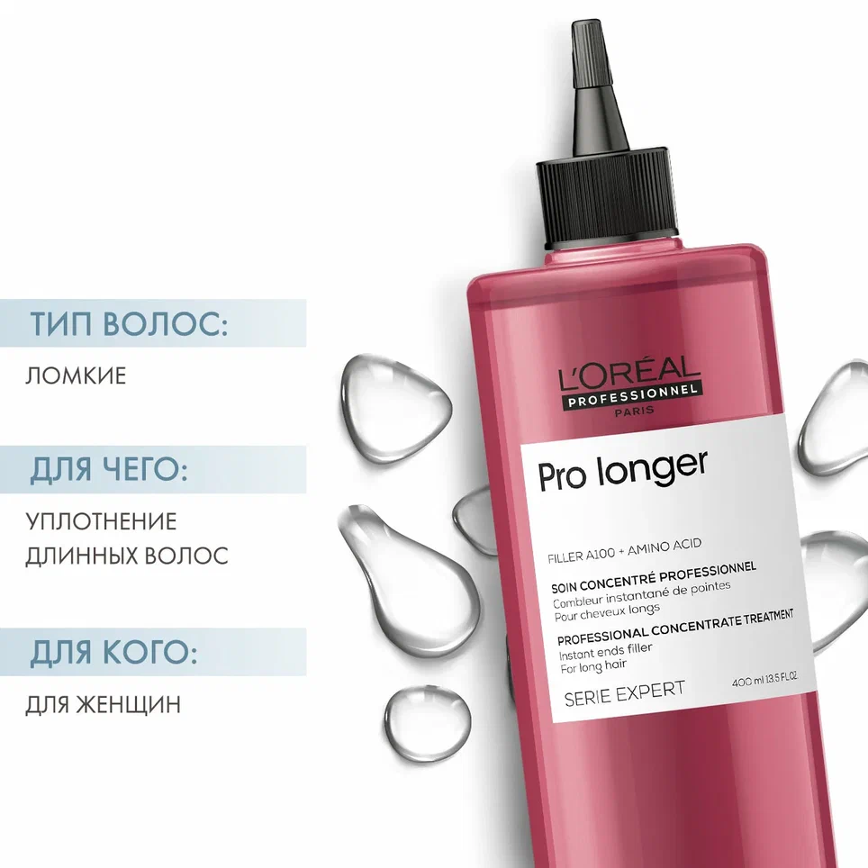 Филлер-концентрат Pro Longer — уникальное средство для длинных волос. Высокая концентрация специального компонента Филлер А-100 мгновенно делает кончики плотнее, защищая их от ломкости и расслоения. Помогает придать волосам стойкость и прочность.