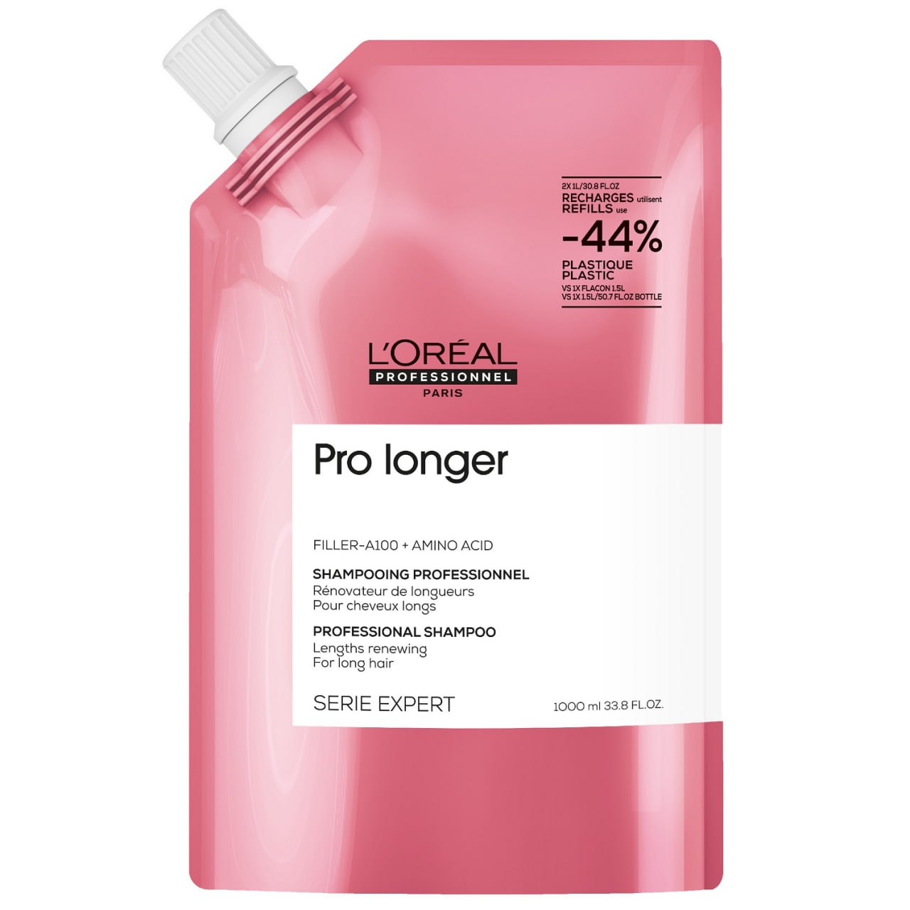 Впервые доступен в экологичном рефил-формате, в котором используется на 65% меньше пластика по сравнению с оригинальной упаковкой. Обогащен Filler-A100 и аминокислотой, которые позволяют мгновенно сократить истончение волокна волоса. По всей длине волосы более сильные и сияющие*.