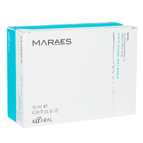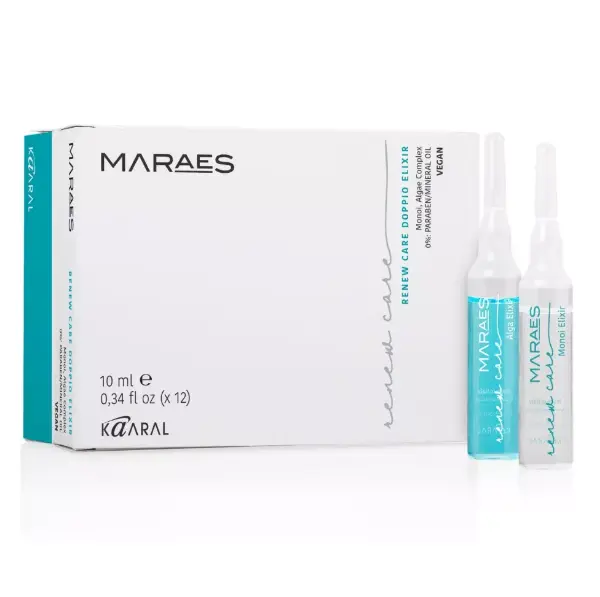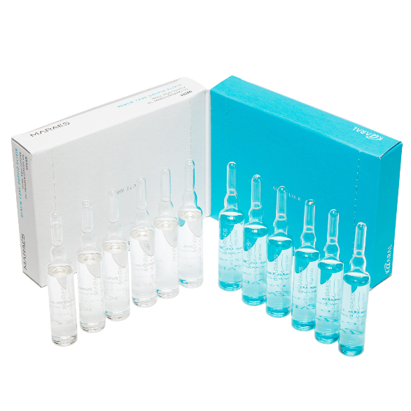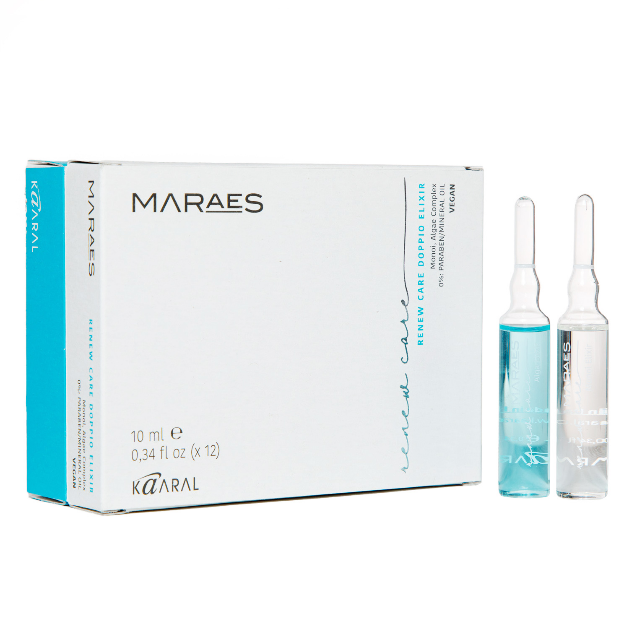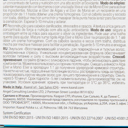 Смешайте две разные ампулы – синего и белого цветов – в пропорции 1:1. Нанесите массу равномерно по всей длине волос – можно использовать щетку или редкий гребень. Оставьте на 5-20 минут, рекомендуется накрыть волосы чтобы средство не высохло на волосах. Тщательно промойте водой.