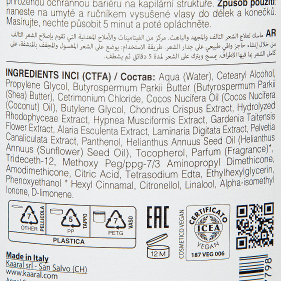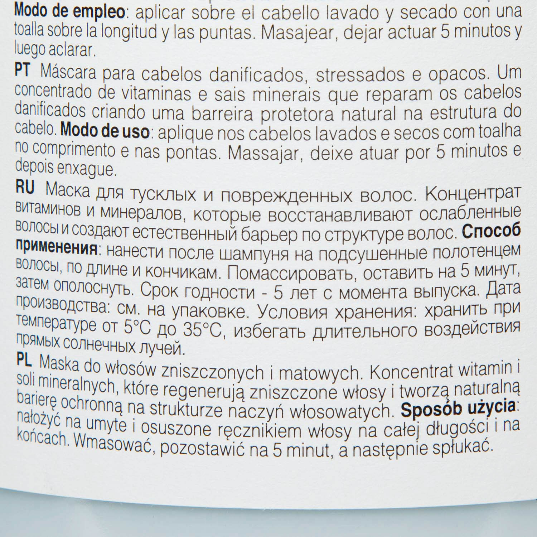 Маска - концентрат витаминов и минеральных солей, которые восстанавливают ослабленные волосы и создают естественный барьер, защищая структуру волос. Подходит веганам.