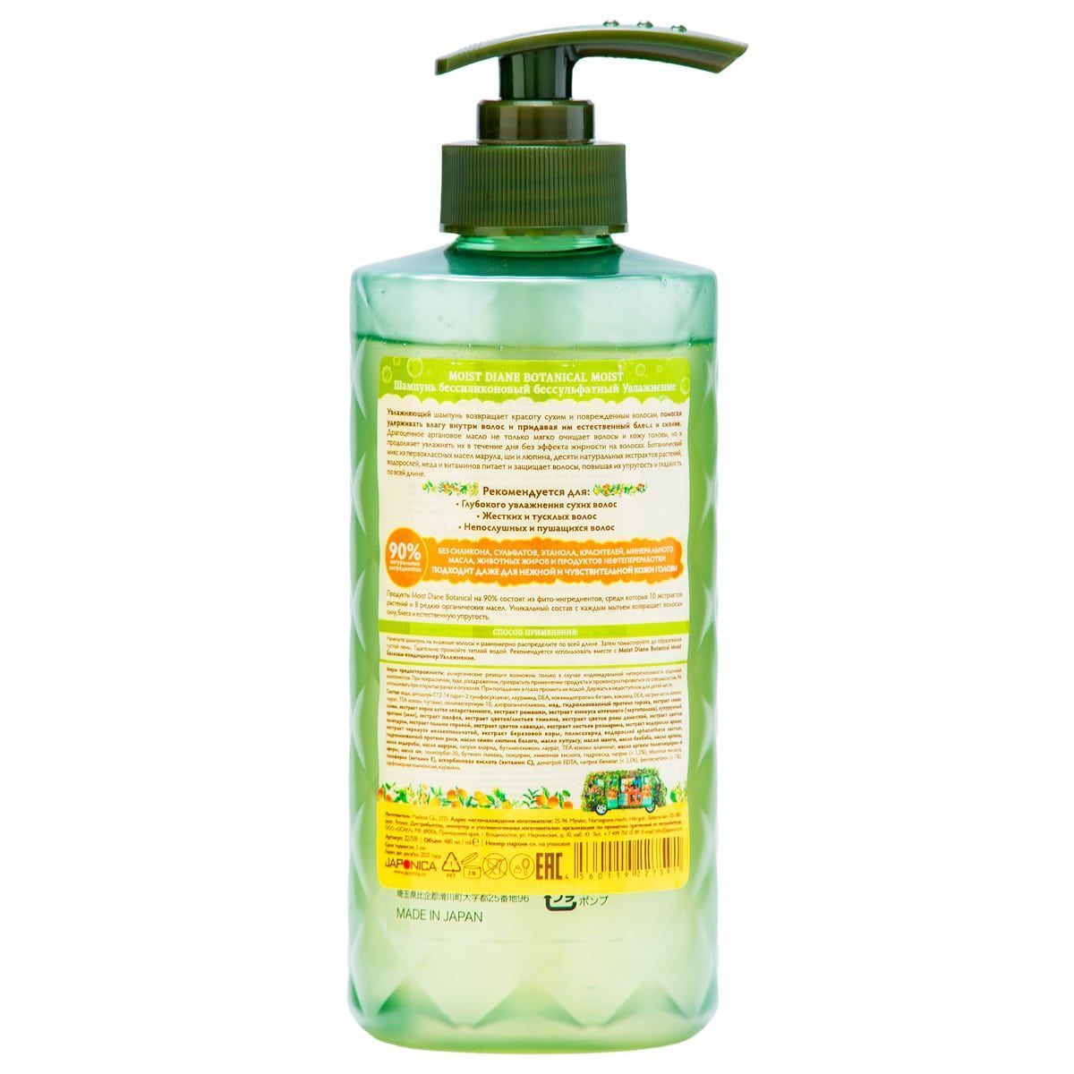 Шампунь не содержит силикон, сульфаты, минеральные масла, этанол, красители, животные жиры и продукты нефтепереработки. Поэтому подходит даже для нежной и чувствительной кожи головы. Для ежедневного применения. Обладает ароматом фруктового жасмина. Рекомендуется использовать вместе с Moist Diane Botanical Moist Бальзам-кондиционер Увлажнение.