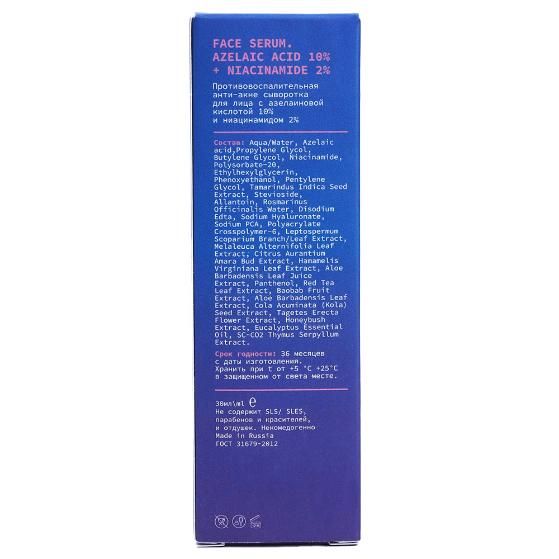Состав: aqua/water, azelaic acid,propylene glycol, butylene glycol, niacinamide, polysorbate-20, ethylhexylglycerin, phenoxyethanol, pentylene glycol, tamarindus indica seed extract, stevioside, allantoin, rosmarinus officinalis water, disodium edta, sodium hyaluronate, sodium pca, polyacrylate crosspolymer-6, leptospermum scoparium branch/leaf extract, melaleuca alternifolia leaf extract, citrus aurantium amara bud extract, hamamelis virginiana leaf extract, aloe barbadensis leaf juice extract, panthenol, red tea leaf extract, baobab fruit extract, aloe barbadensis leaf extract, cola acuminata (kola) seed extract, tagetes erecta flower extract, honeybush extract, eucalyptus essential oil, sc-co2 thymus serpyllum extract.