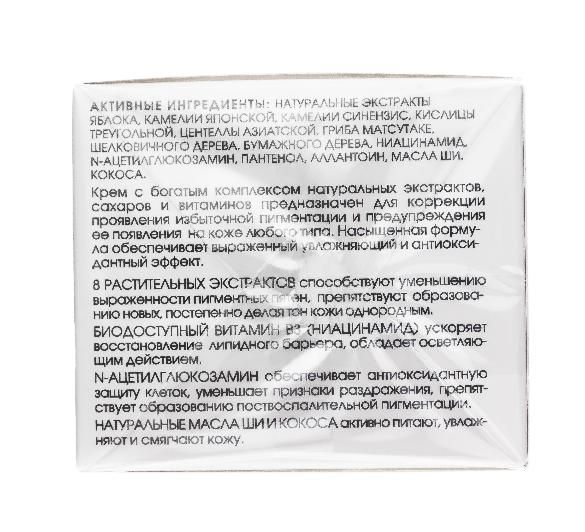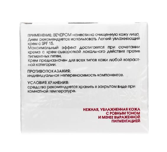 Крем против веснушек и пигментных пятен предназначен для осветления кожи, коррекции её тона. Уменьшает гиперпигментацию, постепенно делая цвет кожи однородным. Активно питает и увлажняет кожу. Насыщенная формула обеспечивает выраженный увлажняющий и антиоксидантный эффект.