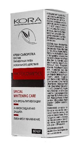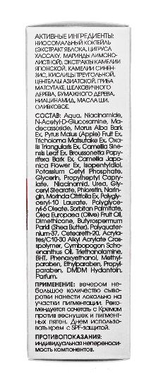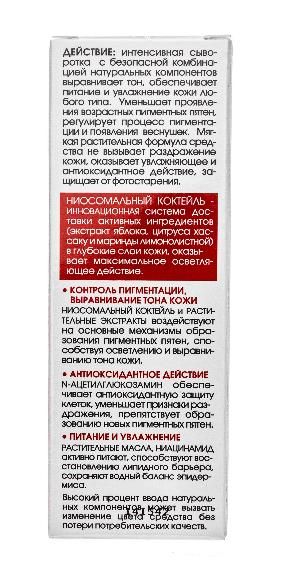 Крем-сыворотка против пигментных пятен оказывает максимальное осветляющее действие, воздействуя на основные механизмы образования пигментных пятен. Ниосомальный коктейль – инновационная система доставки активных ингредиентов (экстракт яблока, цитруса хассаку и маринды лимонолистной) в глубокие слои кожи, оказывает максимальное осветляющее действие. Способствует уменьшению проявления пигментных пятен, в т.ч. возрастных, осветлению и выравниванию тона кожи. Препятствует образованию новой пигментации. Активно питает, восстанавливает липидный барьер, сохраняет водный баланс.