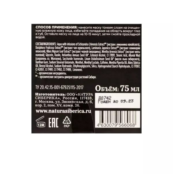 Состав: aqua with infusions of schizandra chinensis extract WH (экстракт лимонника нанайского), dasiphora fruticosa extract WH (экстракт чая курильского), laminaria japonica extract WH (экстракт ламинарии японской), ribes nigrum leaf extract* (экстракт черной смородины), mentha arvensis extract* (экстракт мяты полевой), glycerin, kaolin, helianthus annuus seed oil, cetearyl alcohol, ci 77891, stearic acid, alluvial mud (голубая ледниковая грязь оз.молтаево), saccharide isomerate, linum usitatissimum seed oil* (масло льна сибирского), xanthan gum, sodium stearoyl glutamate, benzyl alcohol, sodium hydroxide, ethylhexylglycerin, menthol, menthyl lactate, caffeine, mentha piperita oil, abies sibirica oil, ci 77007, silica, hydrogenated starch hydrolysate, ci 42051, ci 28440, limonene