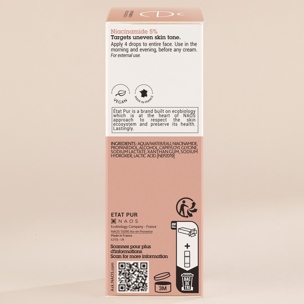 Ниацинамид — форма витамина B3. Способствует улучшению состояния и здоровья кожи. Воздействующий на пигментные проблемы, неровный или тусклый цвет лица, чувствительность кожи, воспаления, покраснения и желтоватый цвет лица. Кожа становится более ровной, сияющей и защищенной от внешних воздействий. Легкая нелипкая текстура сыворотки.