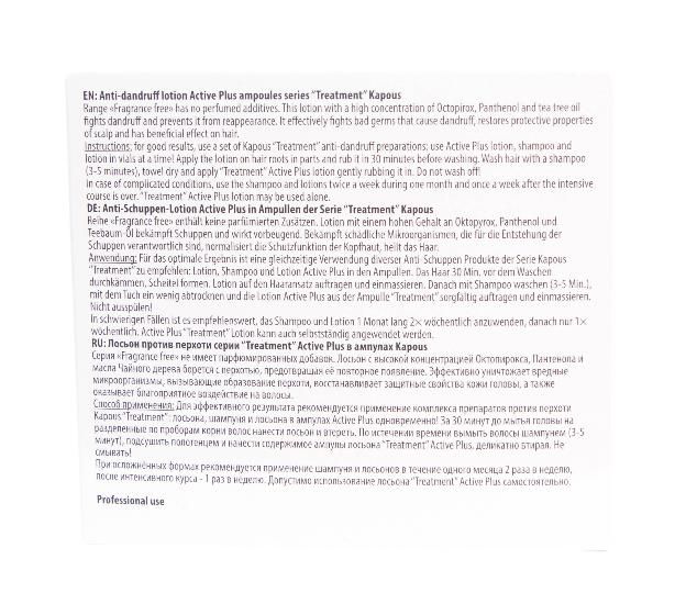 Перед мытьем головы равномерно нанесите на кожу головы лосьон против перхоти «Treatment», вотрите его в кожу и оставьте воздействовать на 20-25 минут, затем вымойте волосы шампунем против перхоти. После мытья необходимо нанести на корни волос содержимое ампулы против перхоти «Treatment» Active Plus и промассировать до ощущения тепла. Ампулированный лосьон не смывать. Допускается использования лосьона «Treatment» Active Plus самостоятельно без комплекса.