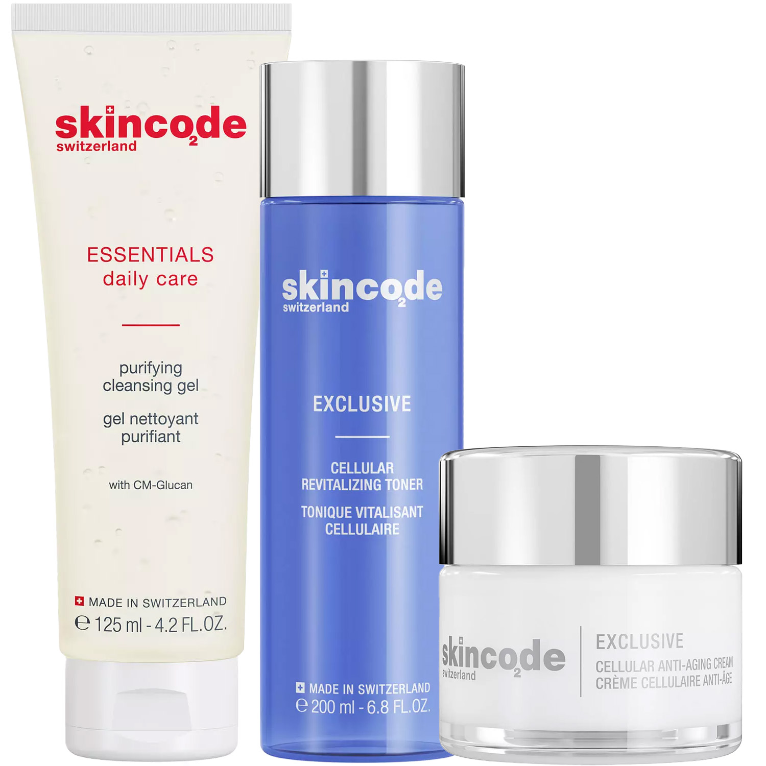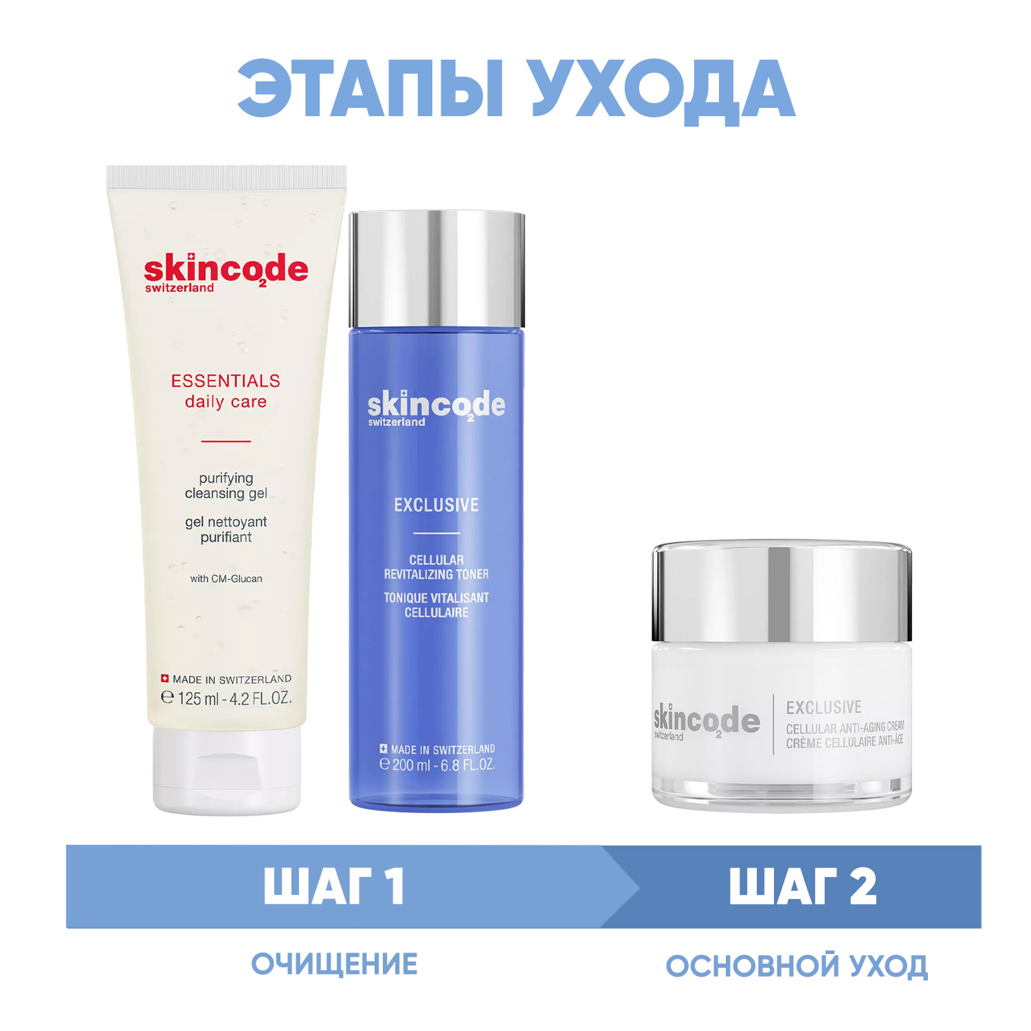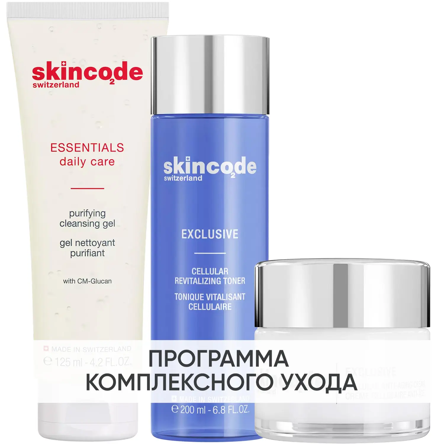 Эксперты проекта «Космедэль»* предлагают ПРОГРАММУ КОМПЛЕКСНОГО УХОДА Skincode Exclusive для борьбы с признаками старения лица. Комплексный уход представляет собой дополняющие друг друга средства, совместное использование которых будет максимально эффективным. Первым шагом такой программы всегда является очищение. Вторым - основной уход, а третим - дополнительный уход.
