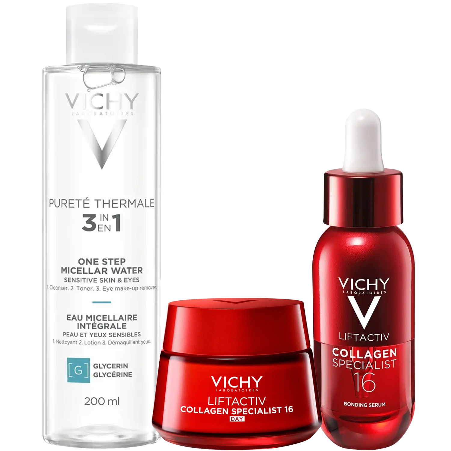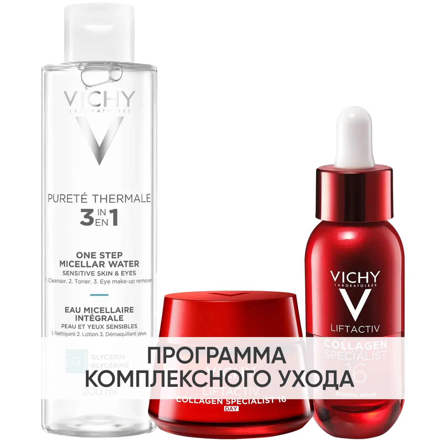 Эксперты проекта «Космедэль»* предлагают пошаговую ПРОГРАММУ КОМПЛЕКСНОГО УХОДА Vichy Collagen Specialist для борьбы с признаками старения лица. Комплексный уход представляет собой дополняющие друг друга средства, совместное использование которых будет максимально эффективным. Первым шагом программы является очищение, вторым - основной уход. В третий шаг вошли дополнительные средства, усиливающие эффект основной программы и применяемые постоянно или периодически на различных этапах ухода.