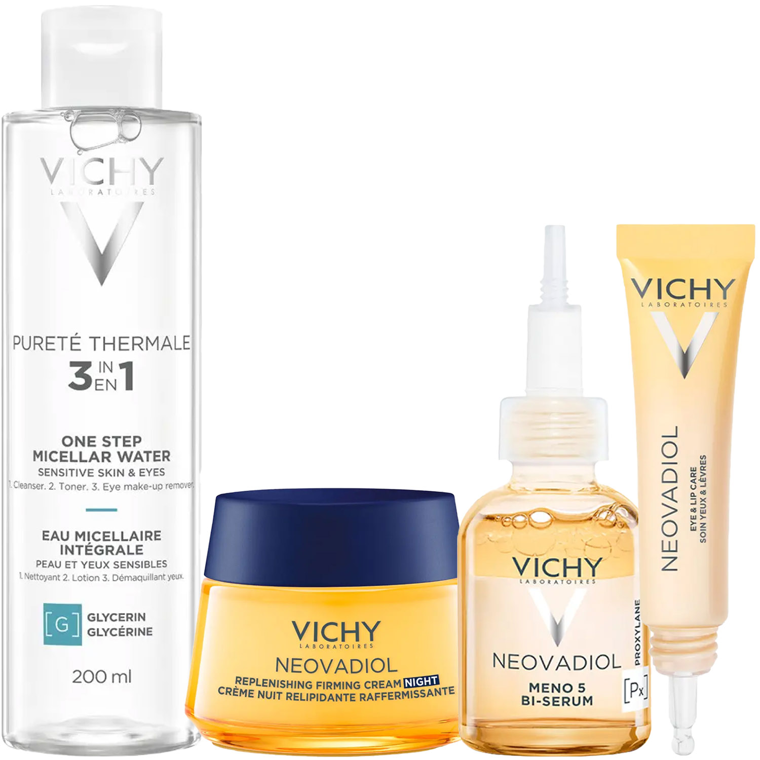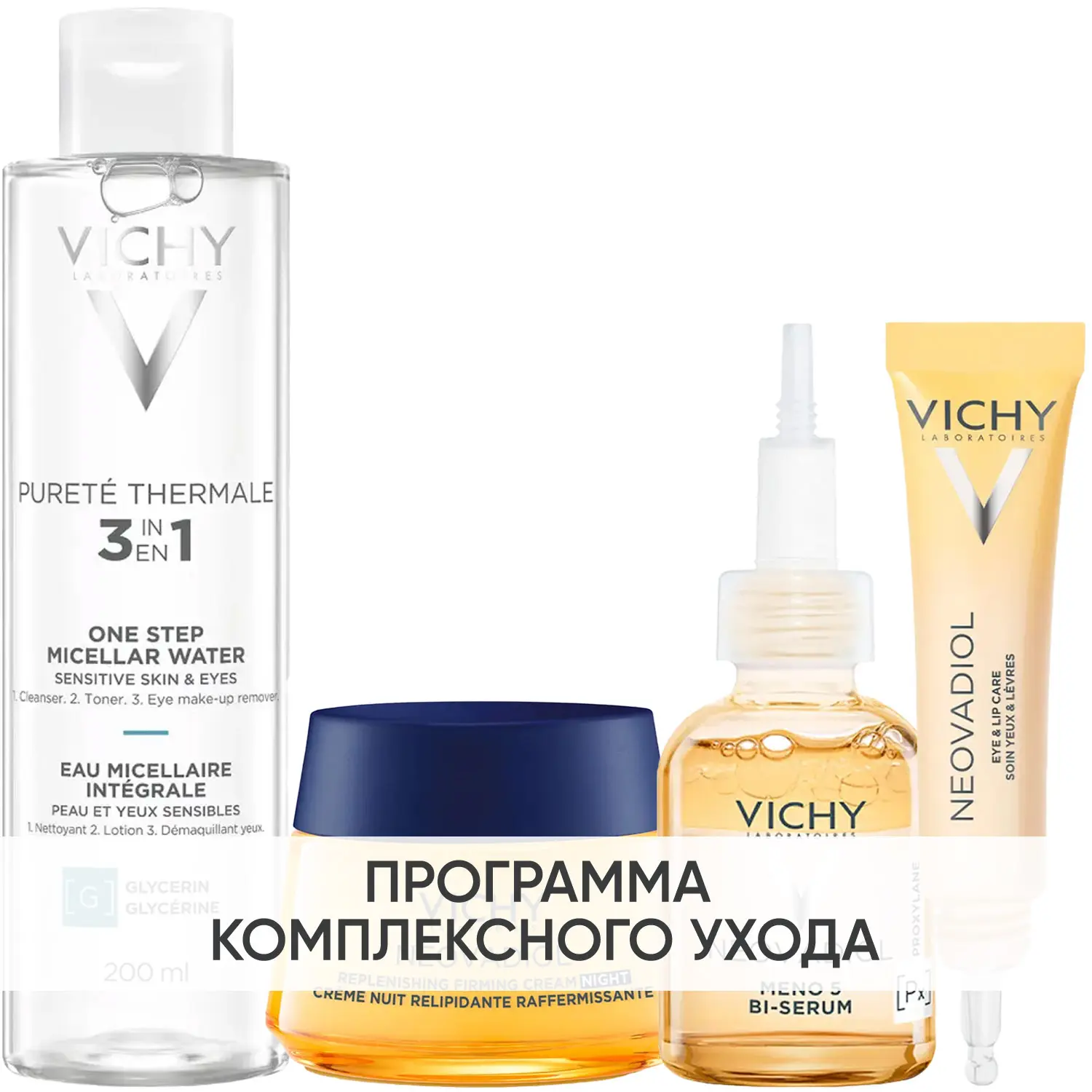 Эксперты проекта «Космедэль»* предлагают пошаговую ПРОГРАММУ КОМПЛЕКСНОГО УХОДА Vichy Neovadiol для коррекции признаков менопаузы на коже. Комплексный уход представляет собой дополняющие друг друга средства, совместное использование которых будет максимально эффективным. Первым шагом программы является очищение, вторым - основной уход. В третий шаг вошли дополнительные средства, усиливающие эффект основной программы и применяемые постоянно или периодически на различных этапах ухода.