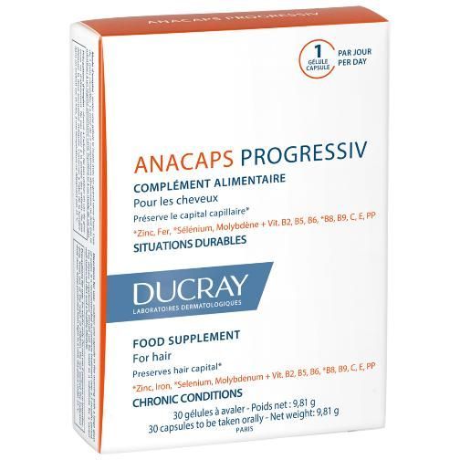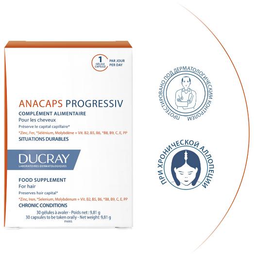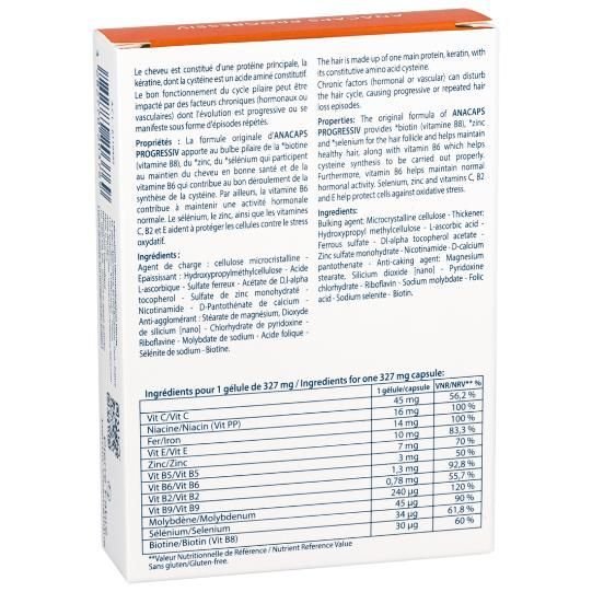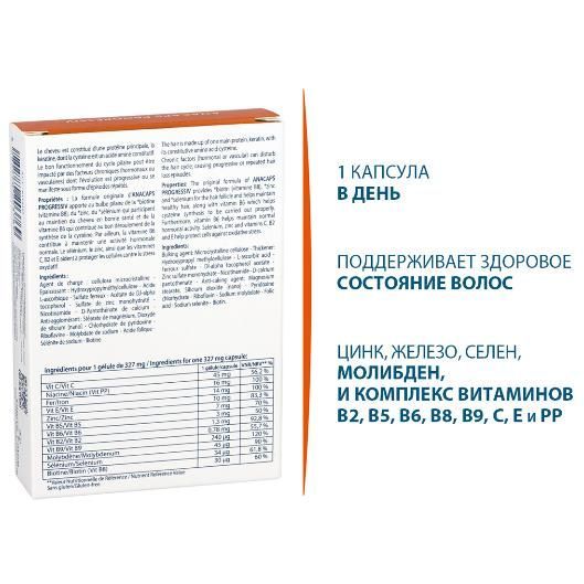 Progressiv Биологически активная добавка к пище для волос и кожи головы питает и укрепляет волосы и ногти, поддерживая их здоровое состояние. Стимулирует рост волос. Борется с проблемой хронического выпадения волос. Дополнительный источник витаминов B2, В3, В6, В8, Е, железа для поддержки здоровья волос. Входящий в состав биотин (витамин В8), цинк и селен поддерживают здоровье волос, витамин В6 помогает поддерживать нормальный гормональный фон.