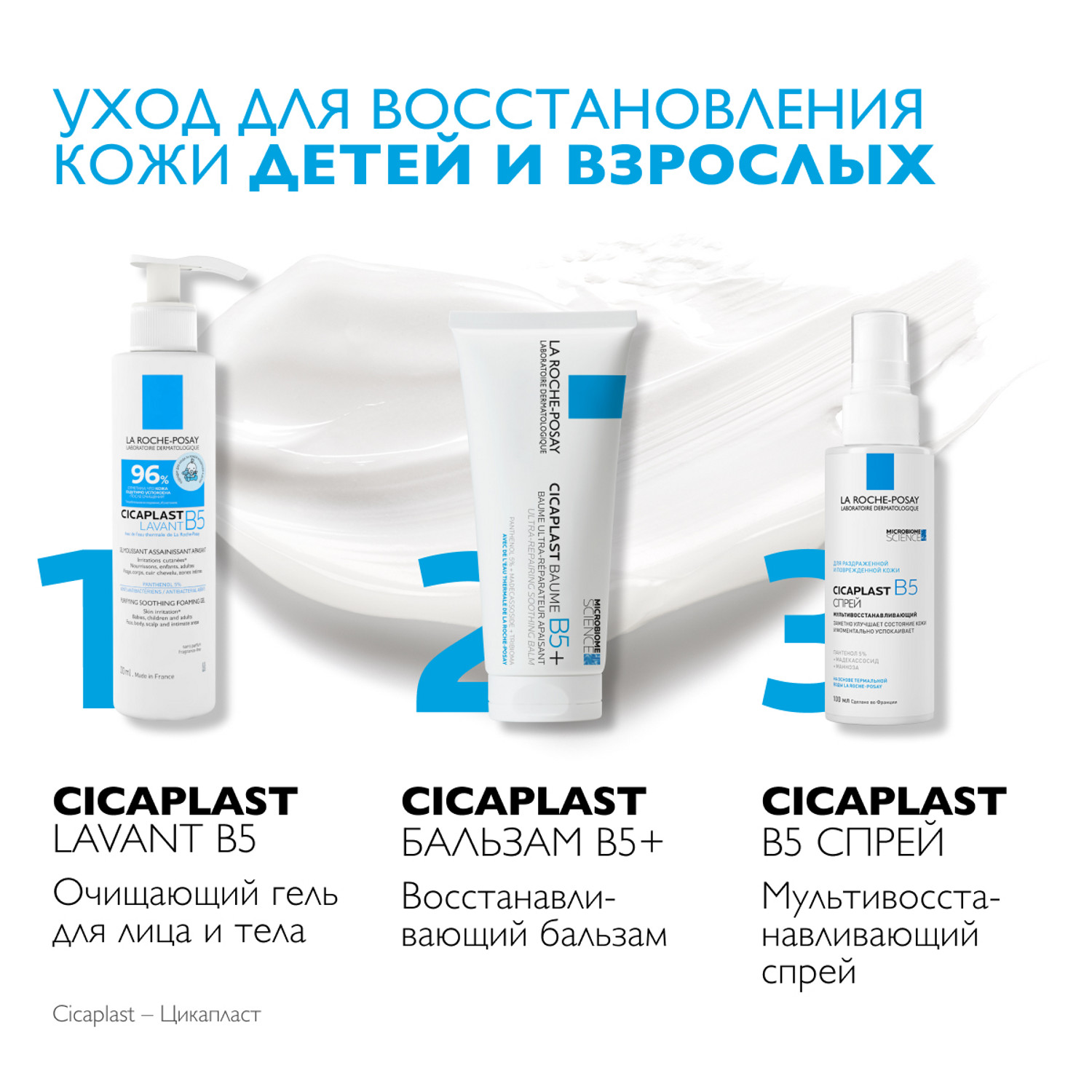 1. Комплексный уход: очищающий крем-гель 200 мл + бальзам 200 мл + бальзам Cicaplast 100 мл