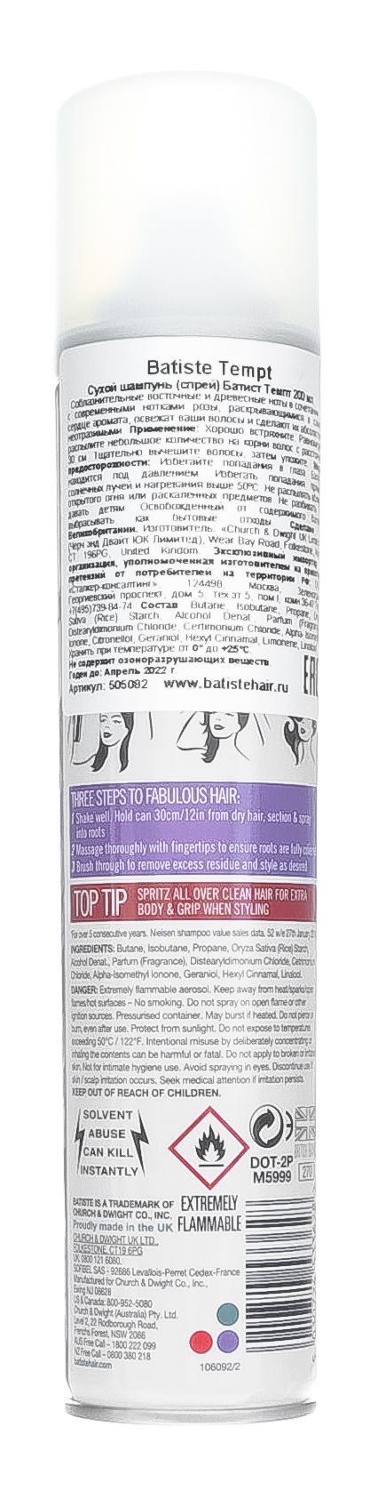 Сухой шампунь Batiste устраняет жирность корней, придавая скучным и безжизненным волосам необходимый блеск, без использования воды. Быстро освежает и повышает силу волос, придает телу волоса и текстуру и оставляет ощущение чистоты и свежести.