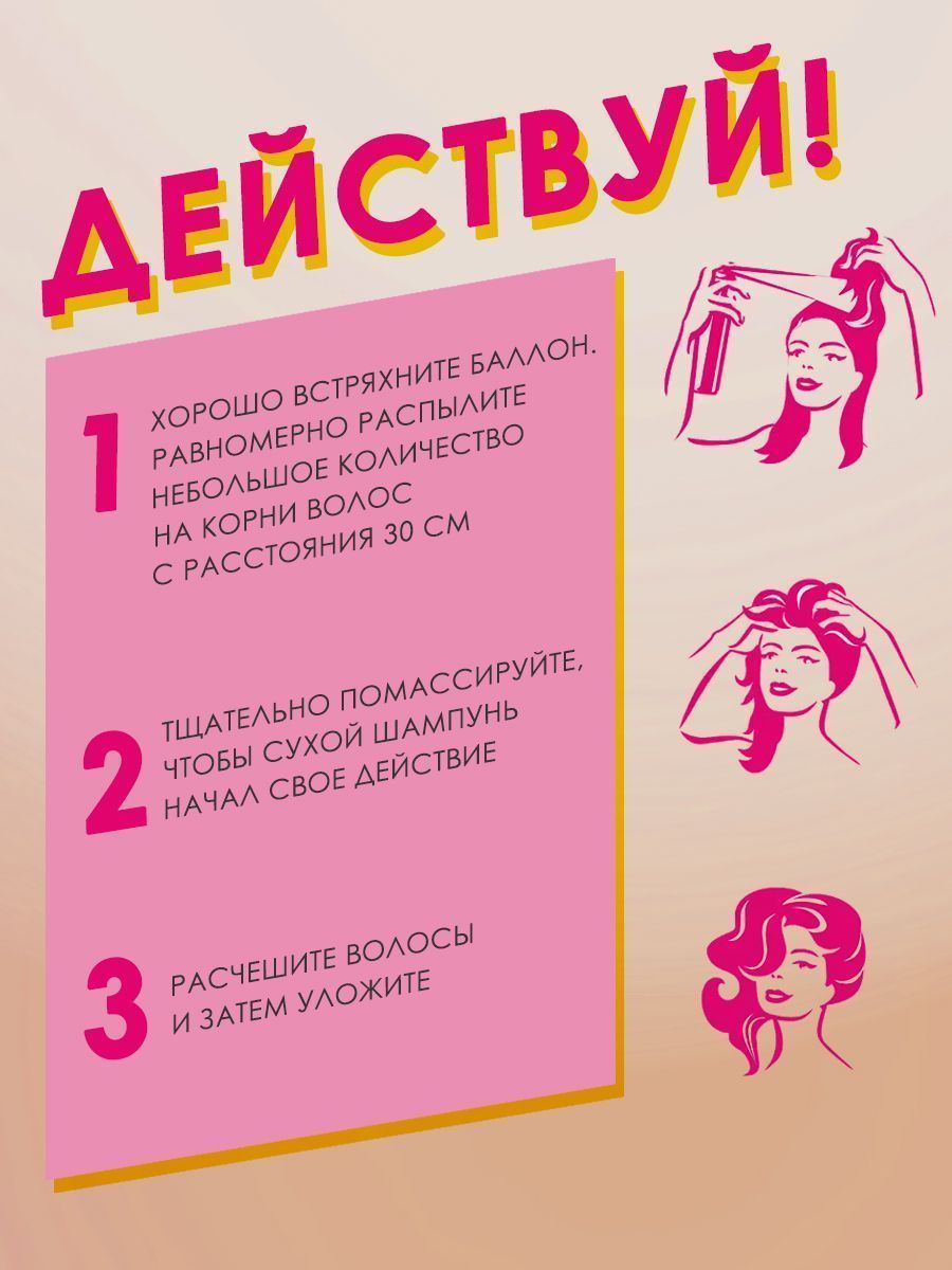 Хорошо встряхните баллон. Равномерно распылите небольшое количество на корни волос с расстояния 30 см. Подождите 3 минуты, тщательно помассируйте, чтобы шампунь начал действовать. Расчешите волосы и затем уложите.